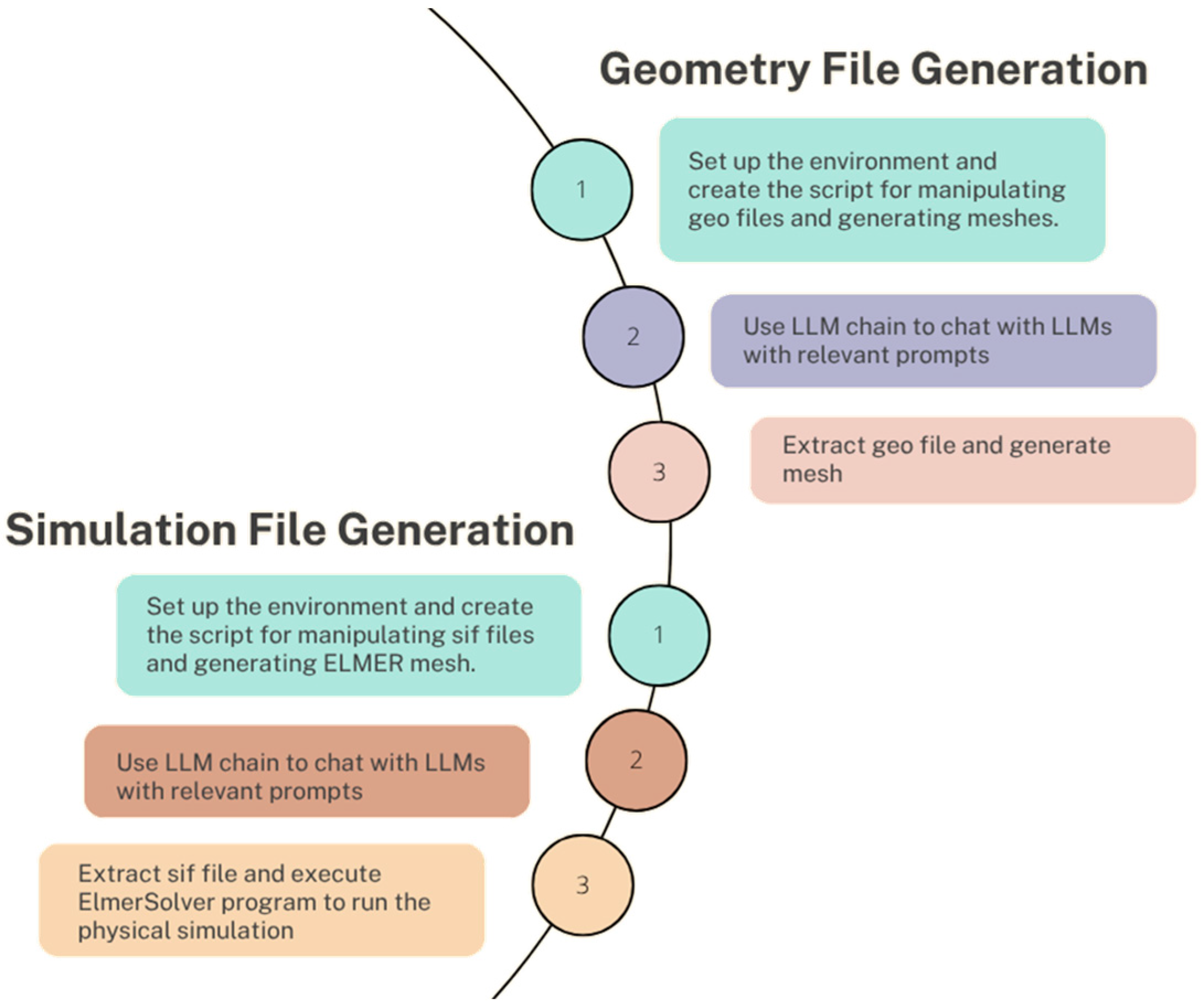 The process begins with setting up the environment and creating scripts that allow for the manipulation of .geo and .sif files, which are necessary for generating geometries and running simulations in Gmsh and ELMER, respectively. These scripts were written in Python, using libraries such as LangChain [16] for interacting with LLMs and Gmsh’s Python API for meshing tasks.