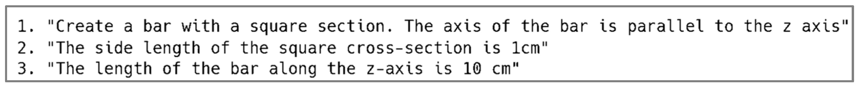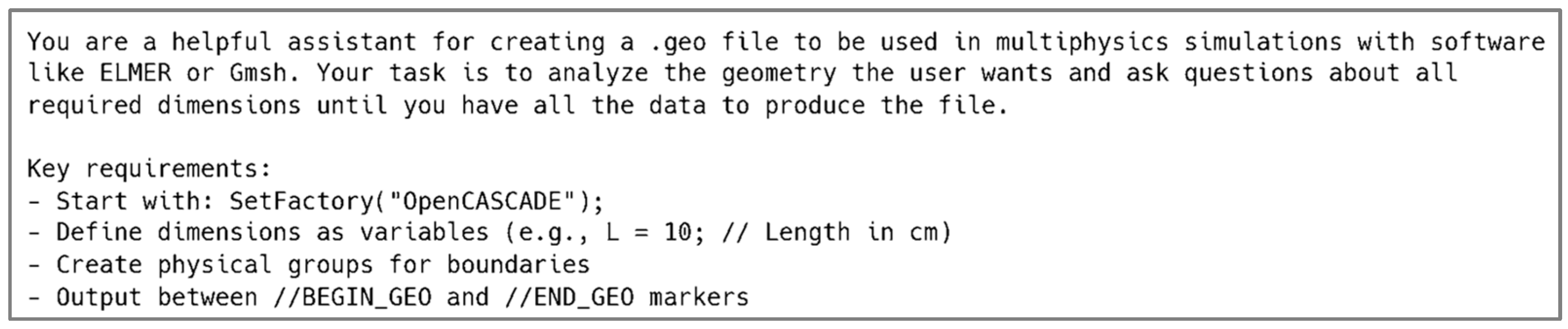 To facilitate effective interaction with the LLMs, we developed prompt templates, comprising a tailored system prompt (Figure 2) and a sequence of user prompts (Figure 3), designed to guide the models in generating the required outputs. These templates were structured to ensure clarity and consistency across different models. Specifically, the templates provided the necessary structure and instructions for the LLMs to generate .geo files, which describe the geometrical properties of the models, and .sif files, which are used as input for ELMER physics-based simulations. This structured approach ensured that the generated files met the requirements for accurate geometry representation and simulation.