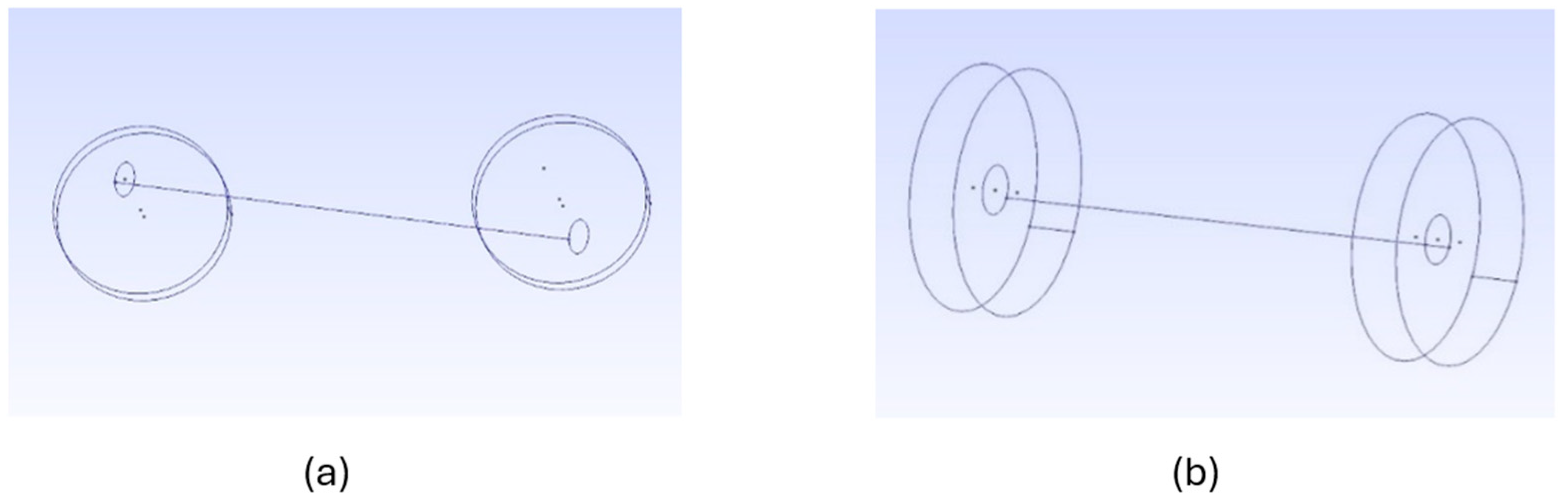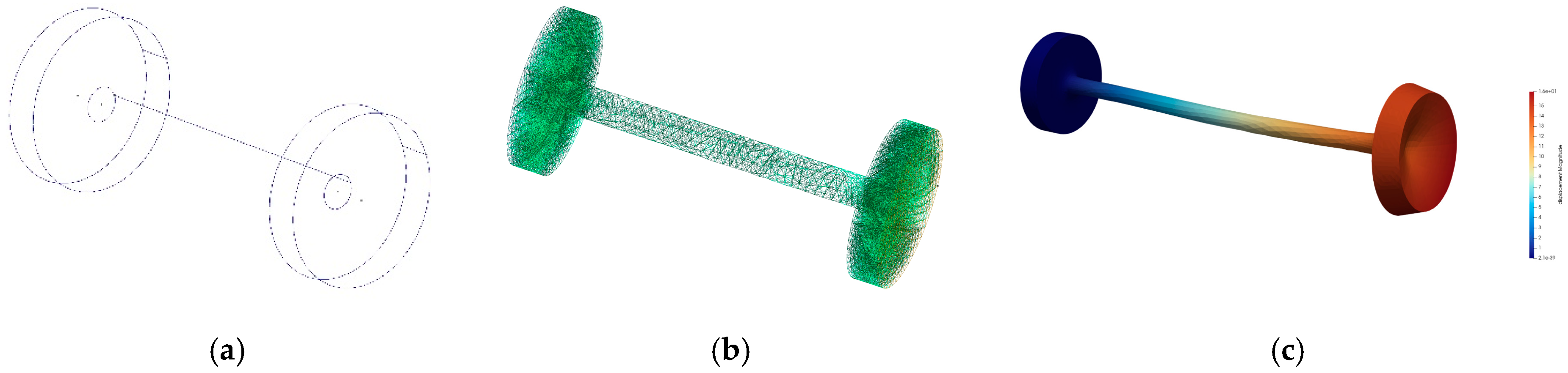Test Case 2: Wheel and axle assembly. Two wheels (r = 5 cm, w = 2 cm) connected by an axle (r = 1 cm, l = 20 cm). Assembly is treated as one unified volume as such fixed at one end of the axle wheel and point load F = 5 GN (giganewtons) applied to the other end of the axle wheel. Material properties: Steel (E = 210 GPa, v = 0.3, p = 7850 kg/m3).