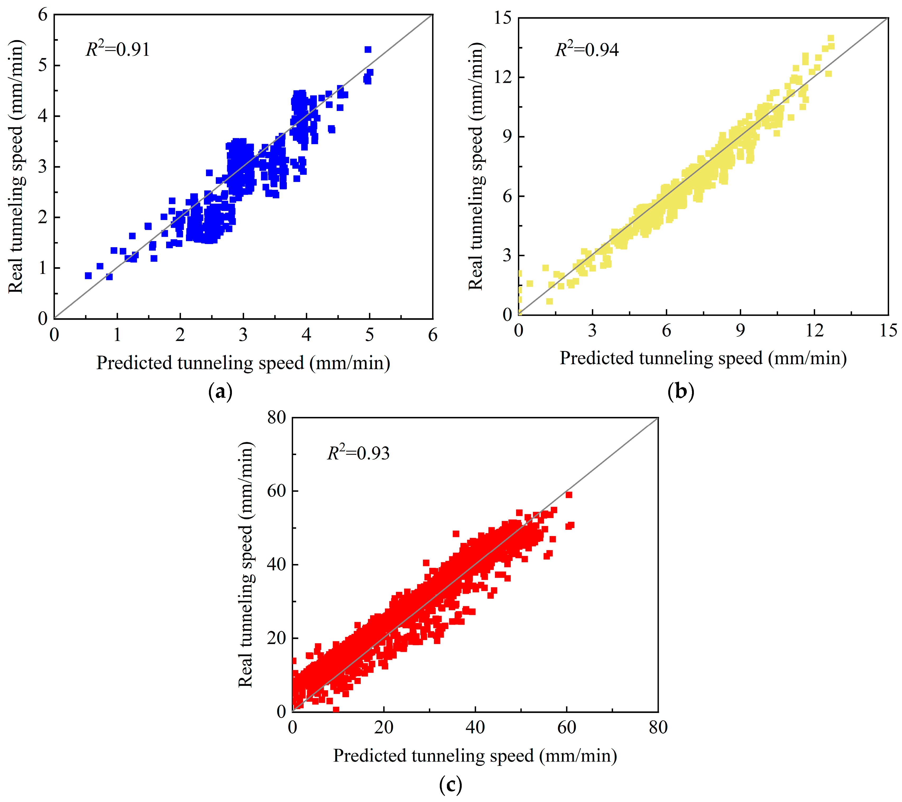 - For the three different surrounding rock conditions, the three BP neural network models optimized by experimental methods and genetic algorithms all demonstrated high prediction accuracy, effectively reflecting the relationship between key construction parameters and excavation speed.