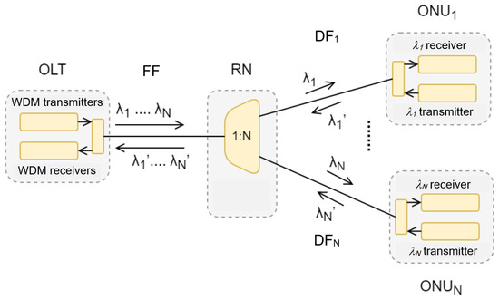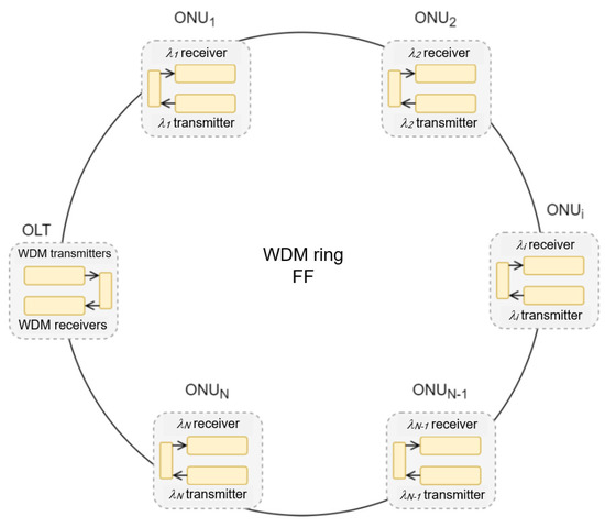 - Yeh, C.; Chow, C.; Huang, S.; Sung, J.; Liu, Y.; Pan, C. Ring-based WDM Access Network Providing both Rayleigh Backscattering Noise Mitigation and Fiber-Fault Protection. J. Light. Technol. 2012, 30, 3211–3218. [Google Scholar] [CrossRef][Green Version]