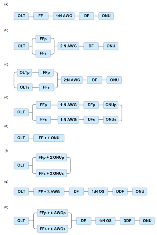 - Róka, R. Performance Analysis of Wavelength Division Multiplexing-Based Passive Optical Network Protection Schemes by Means of the Network Availability Evaluator. Appl. Sci. 2022, 12, 7911. [Google Scholar] [CrossRef]
