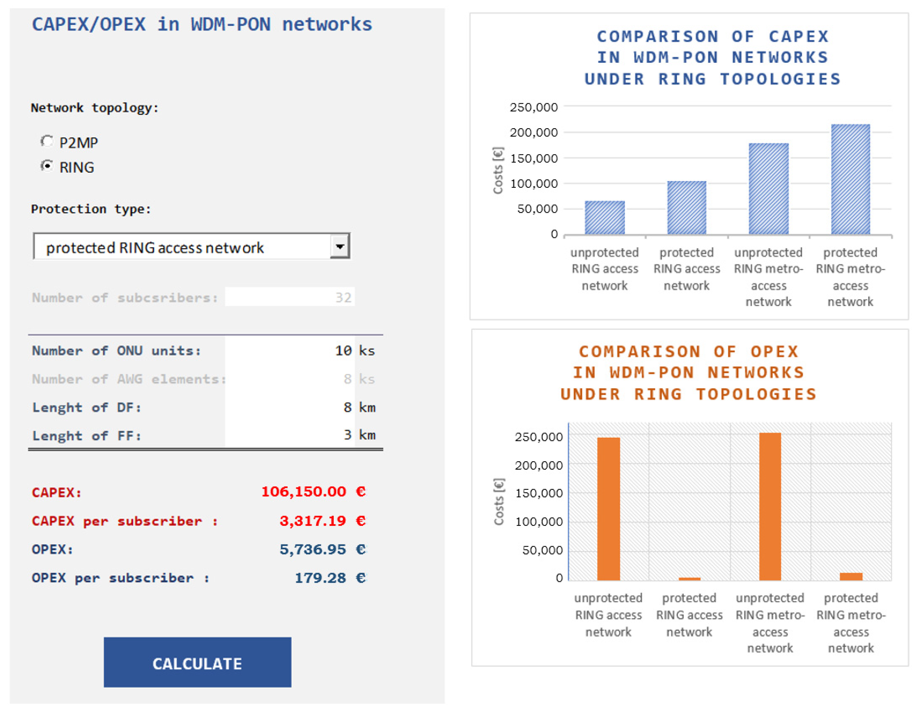 | Protected ring metro-access network | 12,714.52 | 336,750.80 | 349,465.32 |