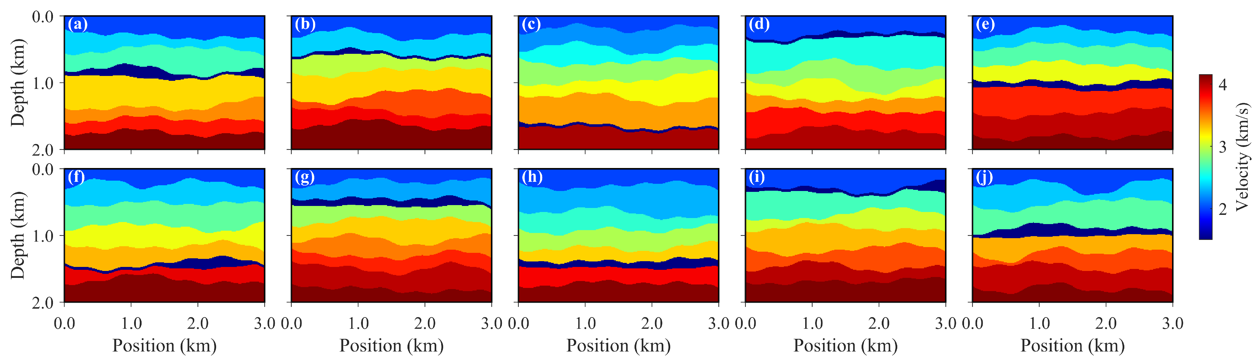 This study constructed a representative dataset of depth-domain velocity models incorporating aquifers. The dataset comprises 2200 samples, each simulating typical multilayer geological structures, with the number of layers (including aquifers) ranging from 8 to 10. The velocity values within the models are set between 1500 m/s and 5000 m/s, covering the typical geophysical velocity variations from shallow sediments to deep bedrock. Each depth-domain velocity model has a grid size of , with both horizontal and vertical spatial sampling intervals of 10 m, corresponding to a physical extent of 2000 m × 3000 m.