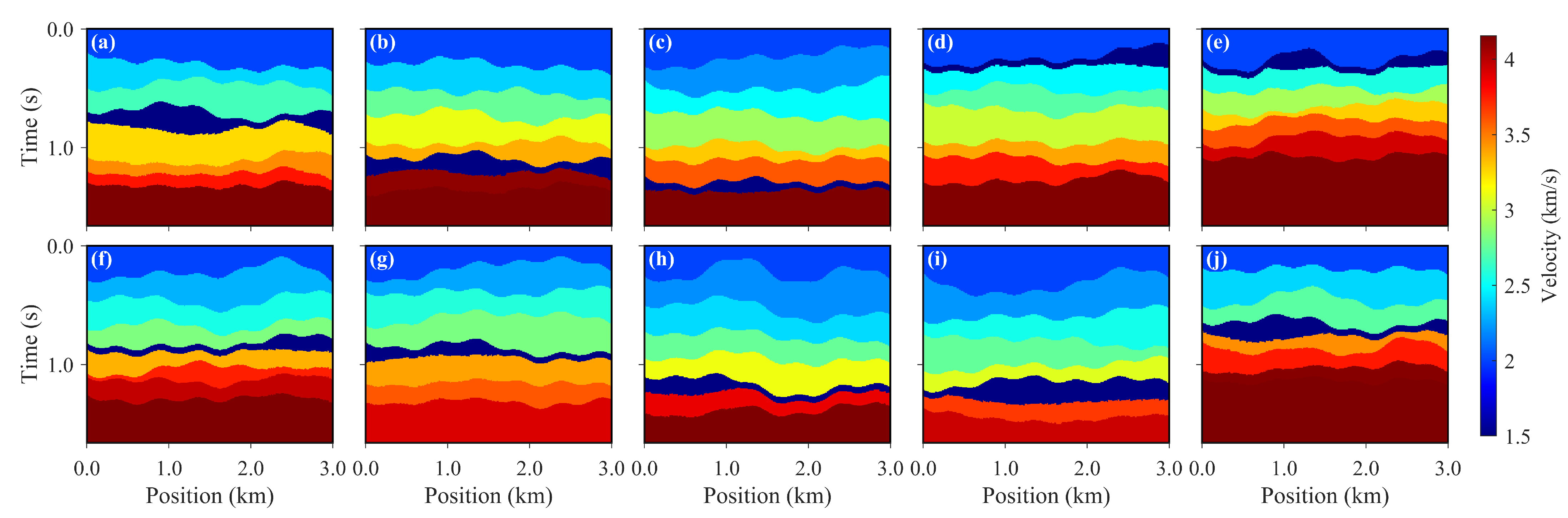 , with the horizontal spatial sampling interval maintained at 10 m, and a temporal sampling interval of 0.002 s in the time–depth direction. This results in an actual physical extent of 1.668 s × 3000 m for the time-domain velocity models. Ten representative samples of the depth-domain aquifer velocity models and their corresponding time-domain velocity models are shown in
