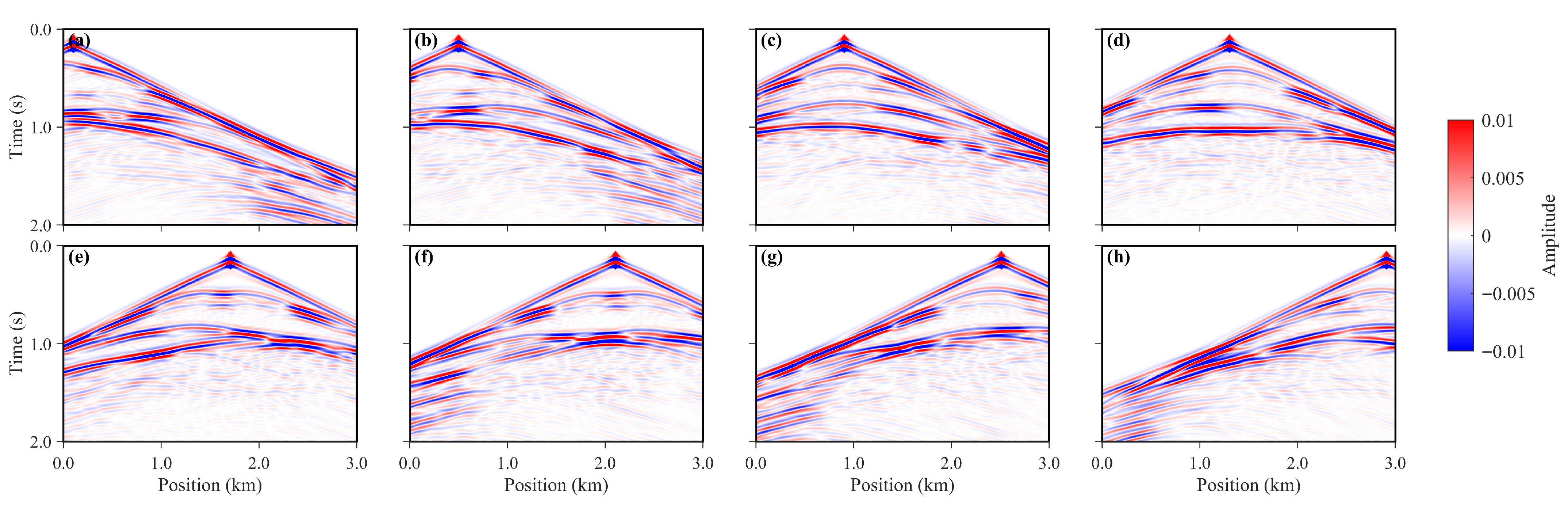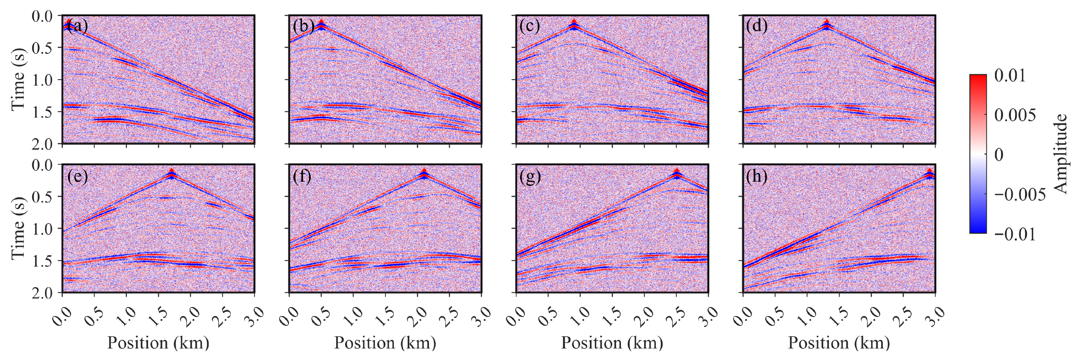 Regarding temporal discretization, the simulation employed a time step of 0.4 ms and a sampling interval of 2 ms, with a total duration of 2 s, sufficiently covering the main wave propagation time while maintaining numerical stability. For the observation system, 8 sources and 301 receivers were evenly distributed at the surface, forming a multi-shot, multi-receiver acquisition geometry to obtain seismic records with high coverage, providing abundant spatiotemporal constraints for network training. An example of 8-shot seismic records corresponding to a single velocity model is shown in