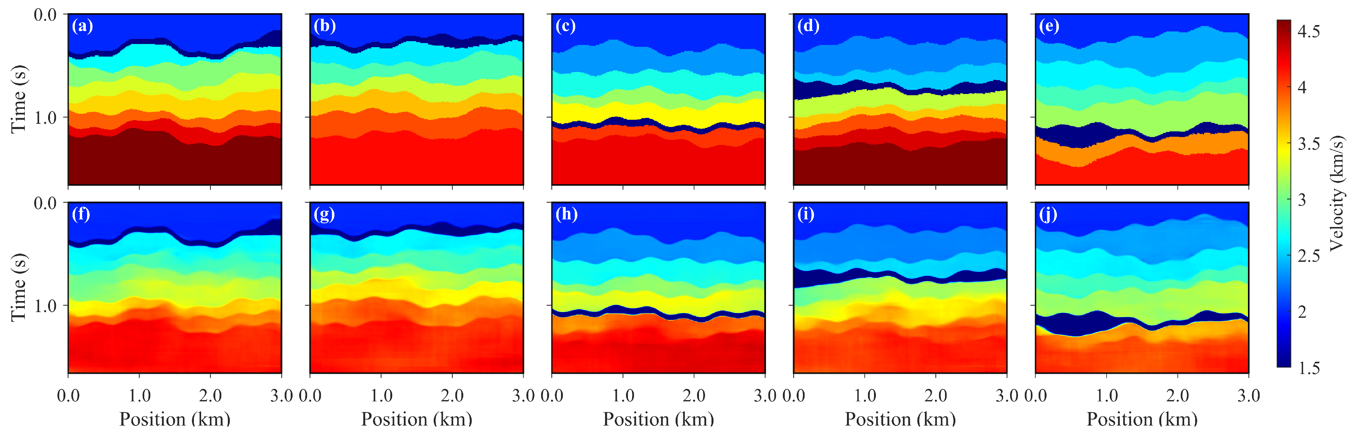 Figure 6, where panels (a)–(e) depict the true time-domain velocity fields and panels (f)–(j) show the corresponding predictions. The figure indicates that the model achieves high accuracy and consistency in reconstructing time-domain velocity fields, accurately recovering the spatial distribution and velocity characteristics of the aquifer. Moreover, the structures and velocity distributions of other geological layers are well reproduced, demonstrating the effectiveness of the proposed time-domain velocity modeling strategy.