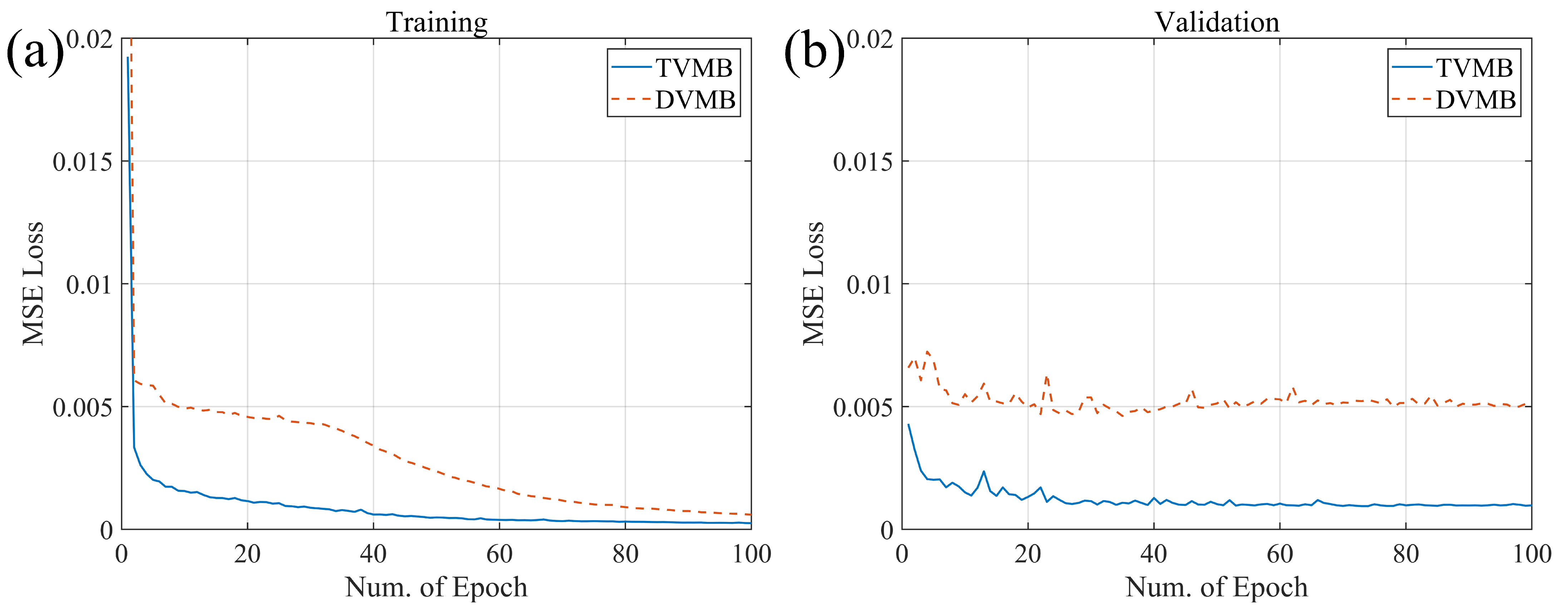 Figure 7. Panel (a) presents the mean squared error (MSE) loss curve for the training set, while panel (b) shows the MSE loss curve for the validation set. It is evident that, in both training and validation phases, the time-domain velocity modeling strategy exhibits faster convergence and lower final loss values, demonstrating a clear advantage over the depth-domain modeling strategy. Specifically, the loss function of TVMB decreases rapidly during early iterations and stabilizes, indicating that the model can more efficiently learn the mapping between seismic records and velocity fields in the time domain. In contrast, DVMB converges more slowly and exhibits larger fluctuations on the validation set, reflecting weaker generalization performance. Overall, the time-domain modeling strategy outperforms the depth-domain approach in terms of stability and convergence, validating its advantages in training efficiency and model fitting capability.