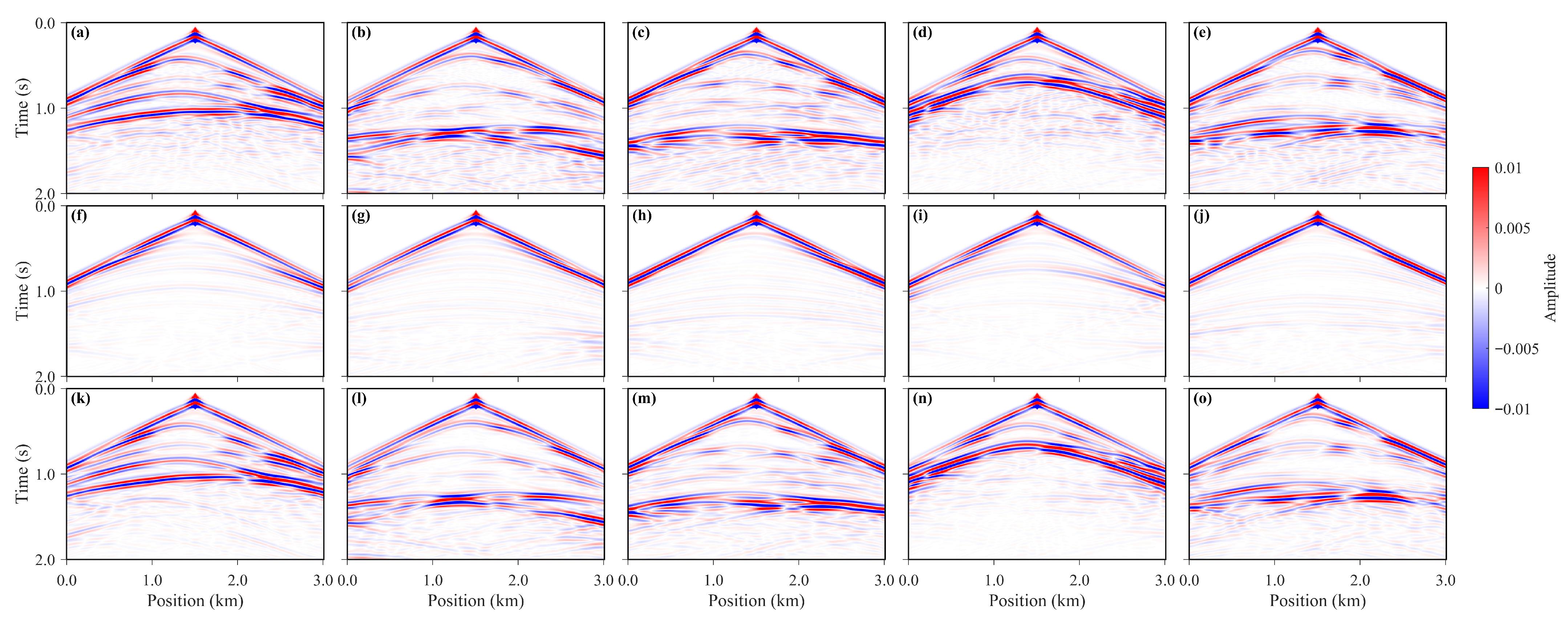 Figure 9. Panels (a)–(e) present the forward records generated from the true velocity fields, panels (f)–(j) correspond to the forward records based on predictions from the depth-domain velocity modeling method, and panels (k)–(o) represent the forward records derived from the time-domain velocity modeling results after conversion to the depth domain. It can be clearly observed that the forward records generated by TVMB closely resemble the true seismic records in terms of waveform shapes, amplitude characteristics, and event continuity. In contrast, the DVMB-derived forward records exhibit deviations in energy distribution along the same phase axes and in phase characteristics, indicating that the predicted velocity fields do not fully capture the detailed variations of the subsurface medium. In particular, at the aquifer and its adjacent layer interfaces, the velocity structures predicted by the TVMB model yield clearer and better-aligned reflection events, demonstrating stronger physical consistency and representational capability in preserving wave propagation dynamics and reconstructing reflective interfaces. Collectively, these forward modeling results provide further evidence of the effectiveness and physical plausibility of the time-domain velocity modeling strategy, showing that its predictions not only outperform the depth-domain approach in quantitative metrics but also better reproduce the seismic response in terms of wavefield propagation features.