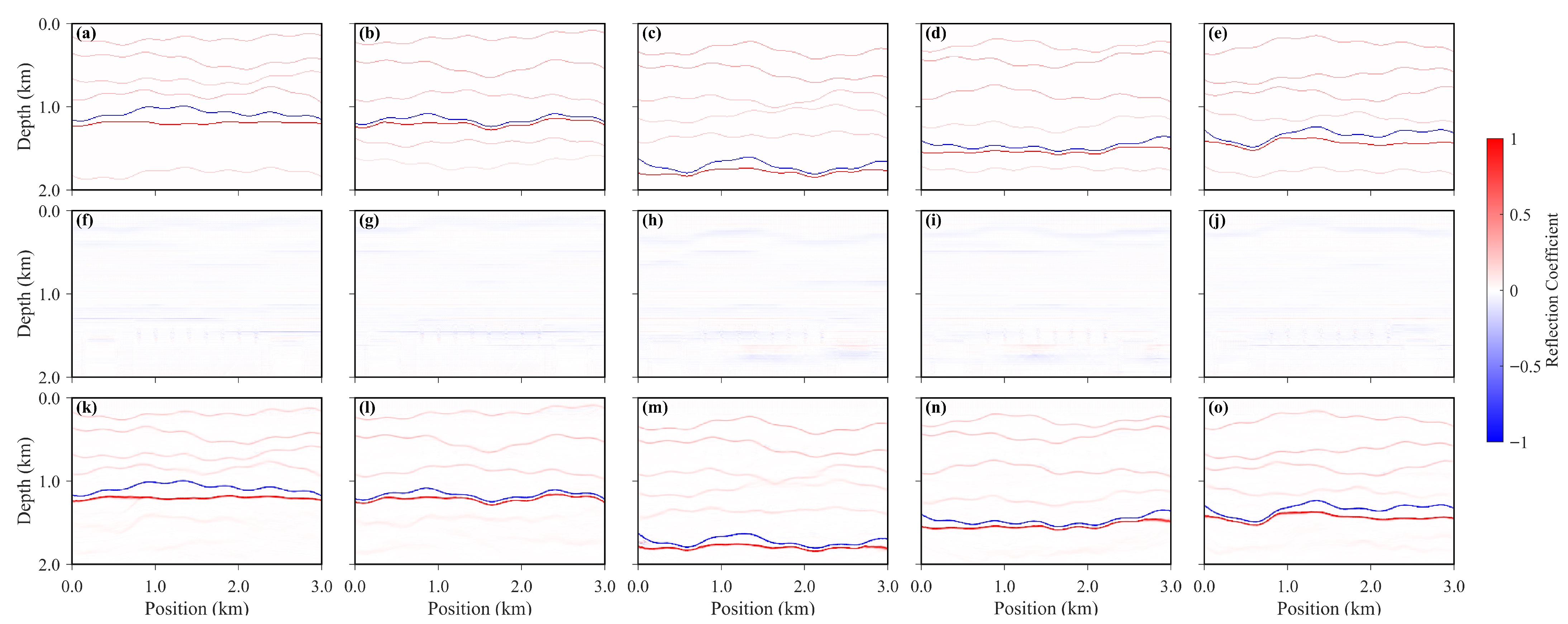 Figure 10, where panels (a)–(e) correspond to the true reflection coefficient profiles, panels (f)–(j) represent the reflection coefficients derived from the DVMB predictions, and panels (k)–(o) show the reflection coefficients obtained from the TVMB results after conversion to the depth domain. It can be clearly observed that the reflection coefficients calculated from the TVMB velocity fields, after conversion to the depth domain, exhibit a higher degree of consistency with the true profiles in terms of the spatial distribution of reflection interfaces, amplitude variations, and inter-layer reflection details. Specifically, the TVMB-derived profiles preserve the lateral continuity of strong reflection interfaces and accurately capture the details of weakly reflective layers, whereas the DVMB-derived profiles show certain deviations in interface accuracy and detail reconstruction. These observations indicate that the TVMB approach achieves superior precision in constructing depth-domain velocity fields and subsequent reflection coefficient computation, more accurately reflecting the reflective characteristics of the subsurface medium. In this study, the reflection coefficient under the constant-density assumption is expressed as follows: