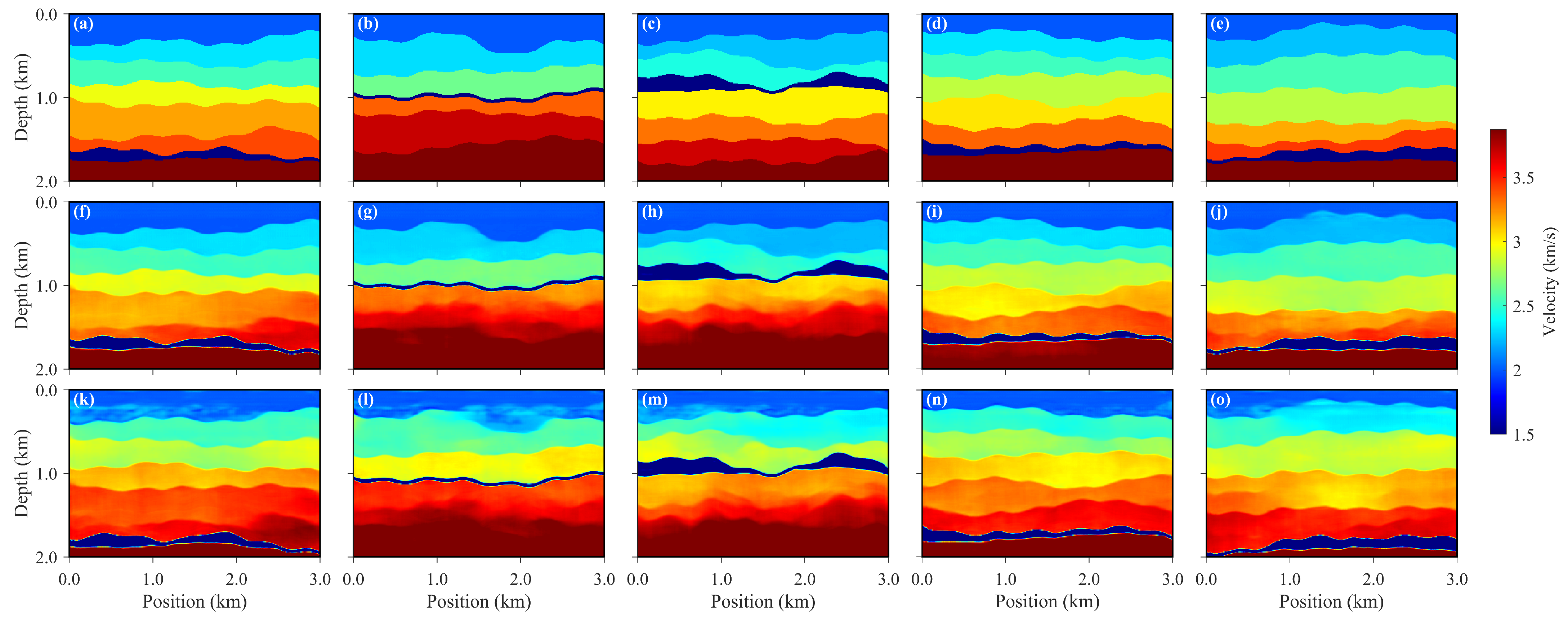 Based on these depth-domain models, the time–depth conversion was applied to generate the corresponding time-domain velocity models, yielding a dataset of 2200 time-domain samples. The converted time-domain velocity models have a uniform grid size of