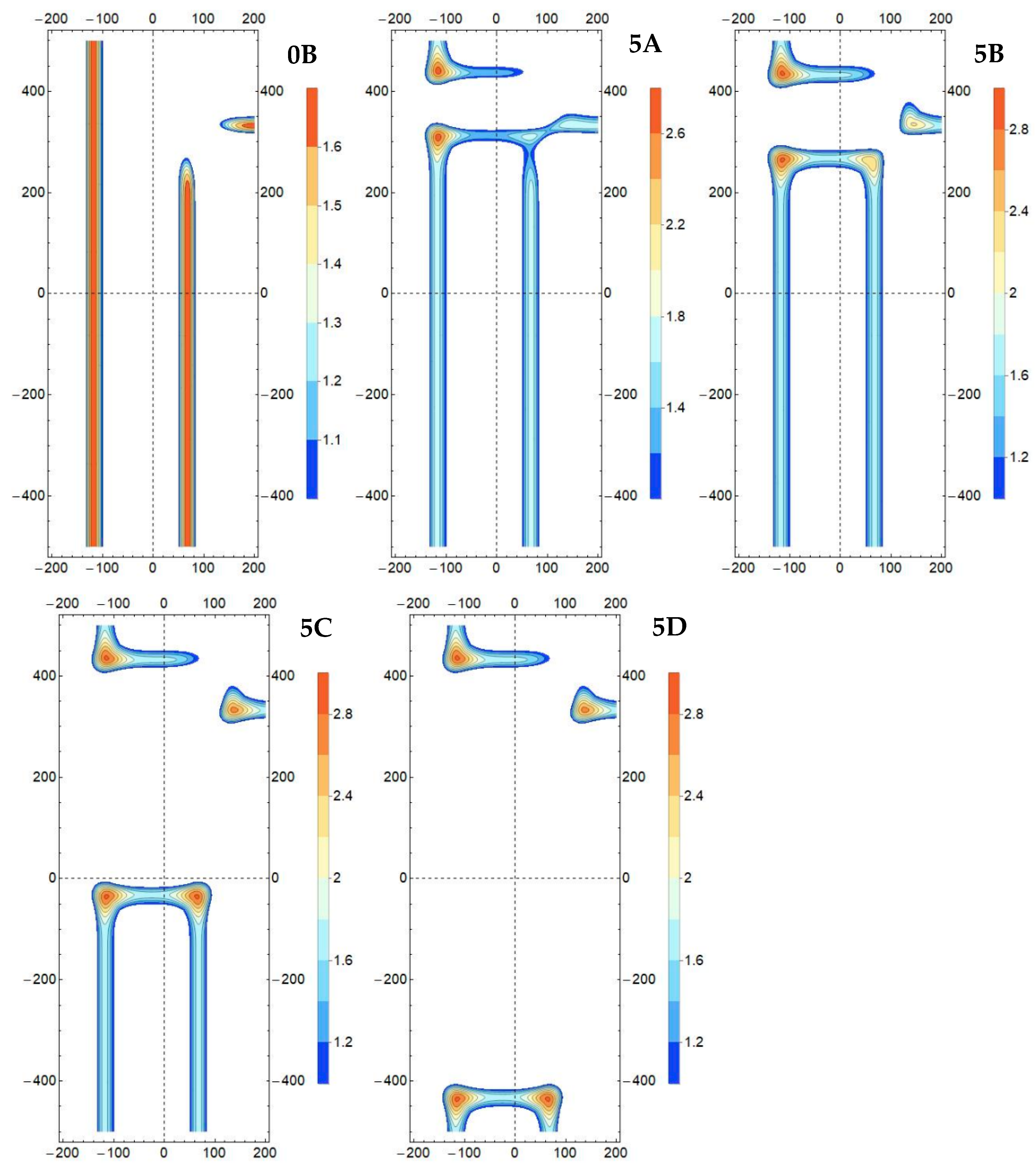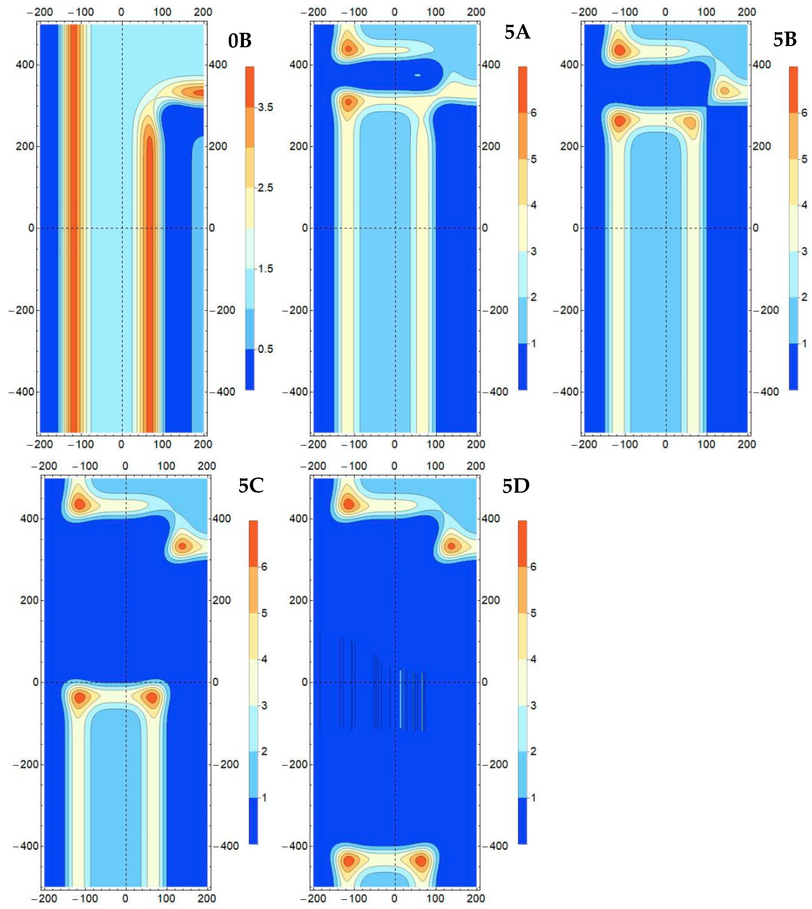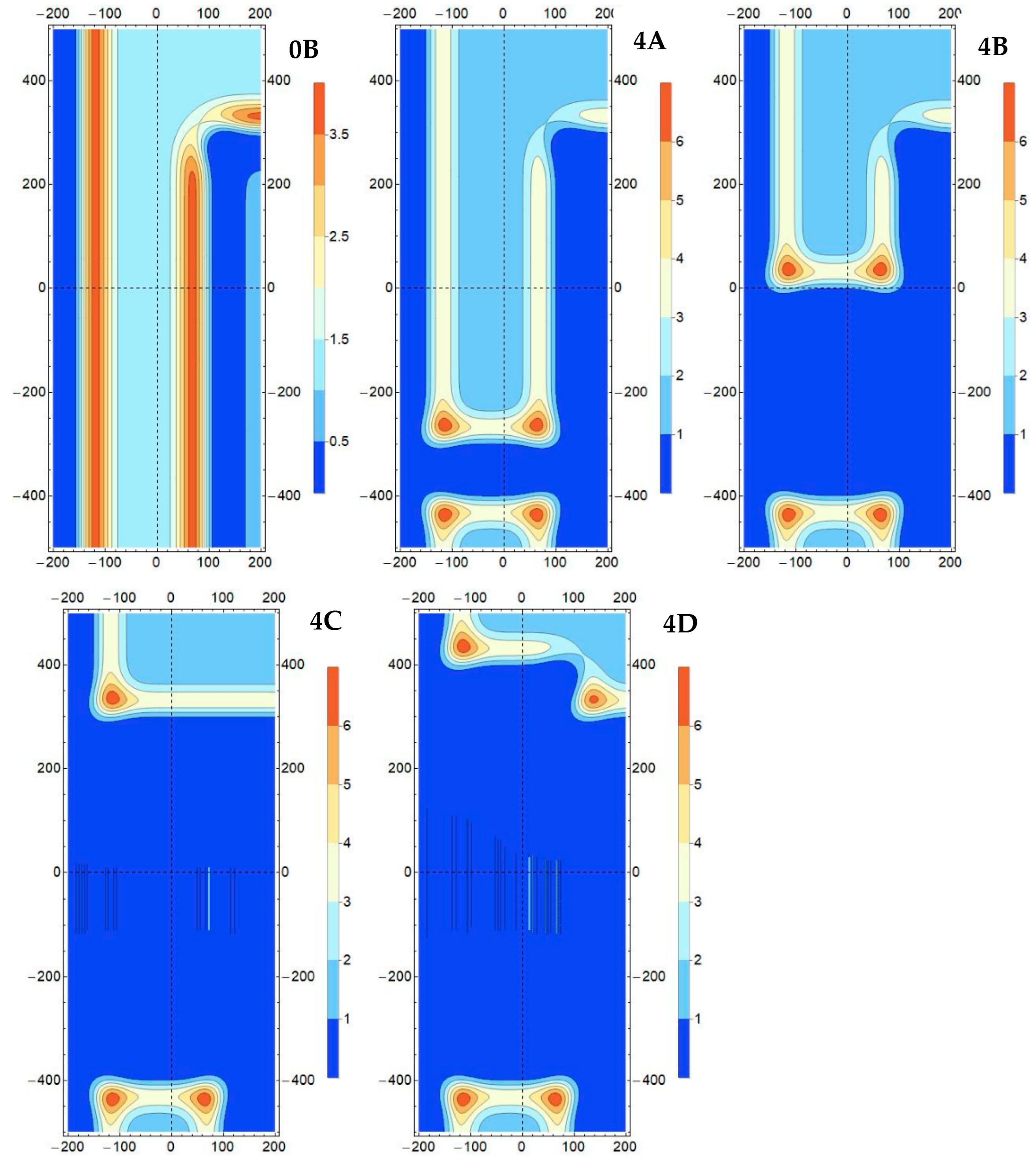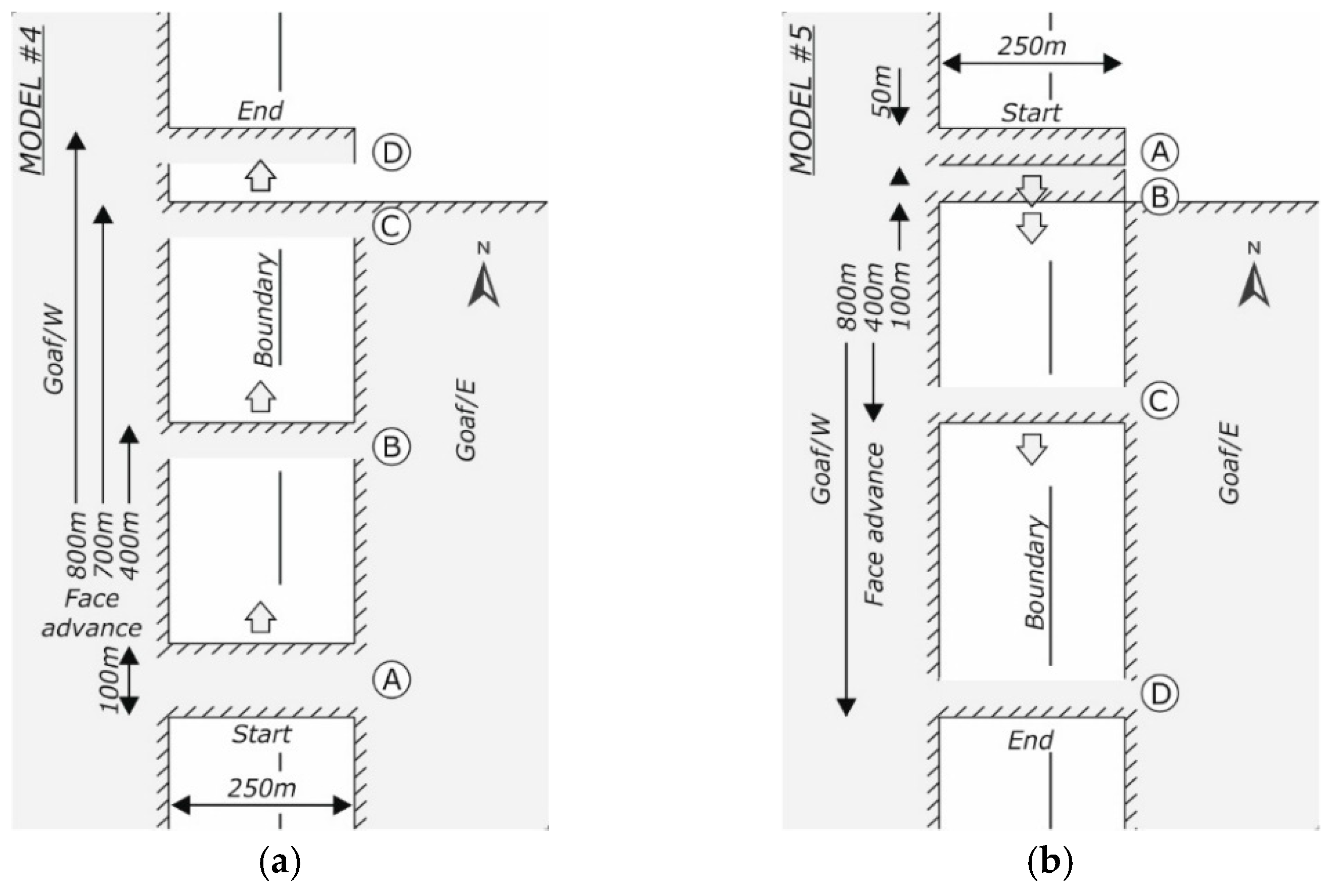 - Variant 2: Exploitation of the deposit in a two-sided environment of the goafs with a working face length of 250 m (Model #5) conducted in the (conventional) southern direction, with an illustration of the results for four of its instantaneous positions—after achieving a face advance of 50 m (Model #5A), 100 m (Model #5B), 400 m (Model #5C), and 800 m (Model #5D) (Figure 3b).