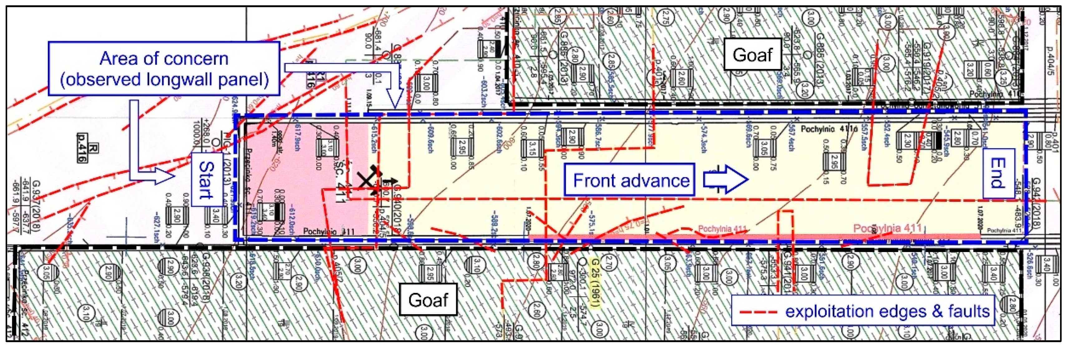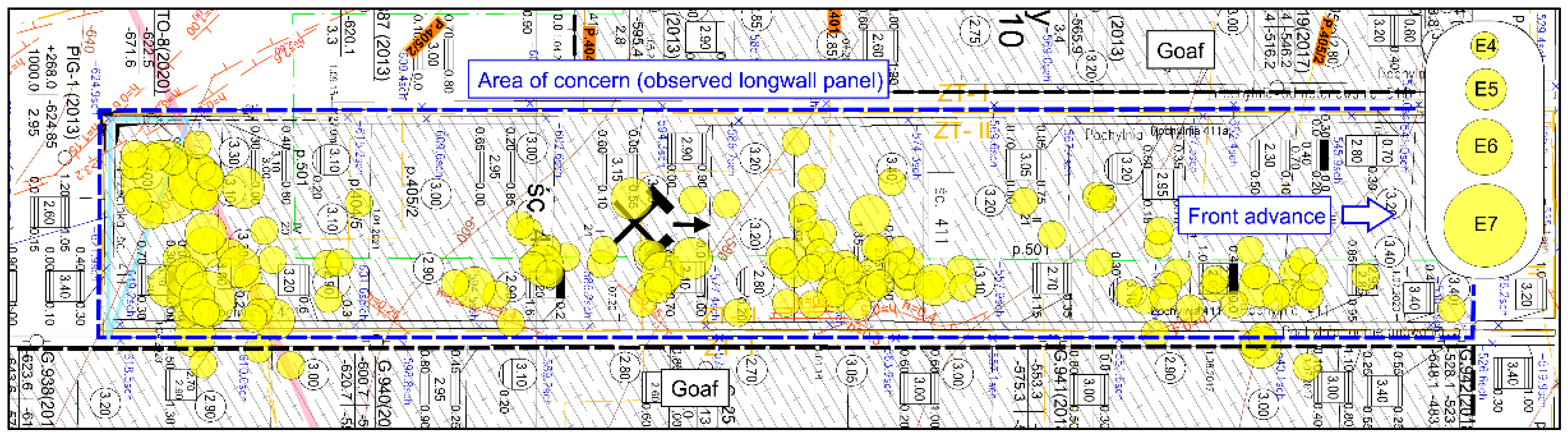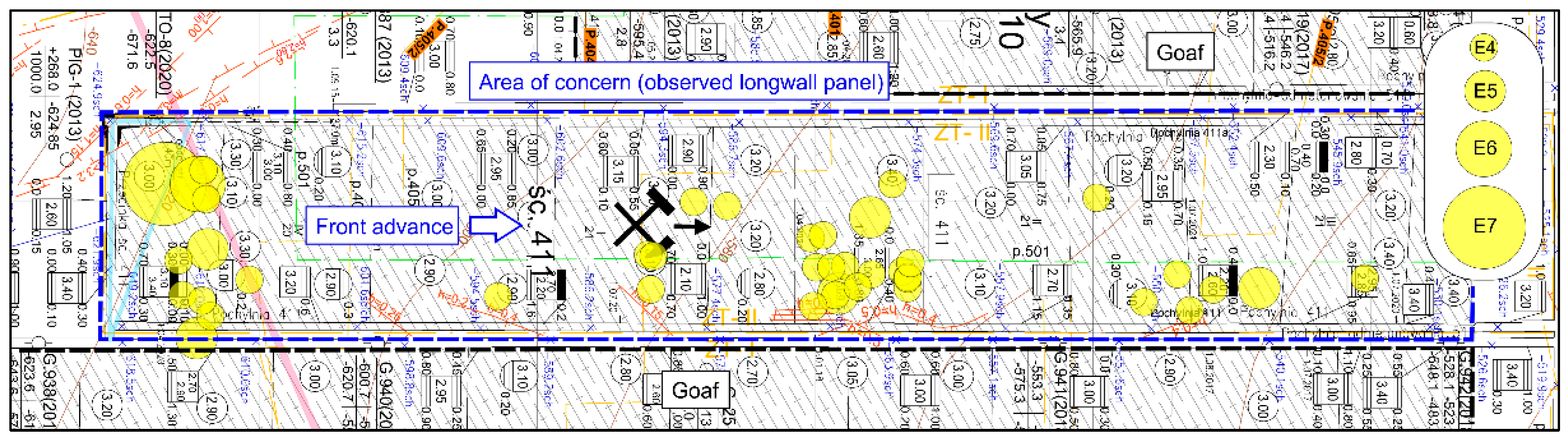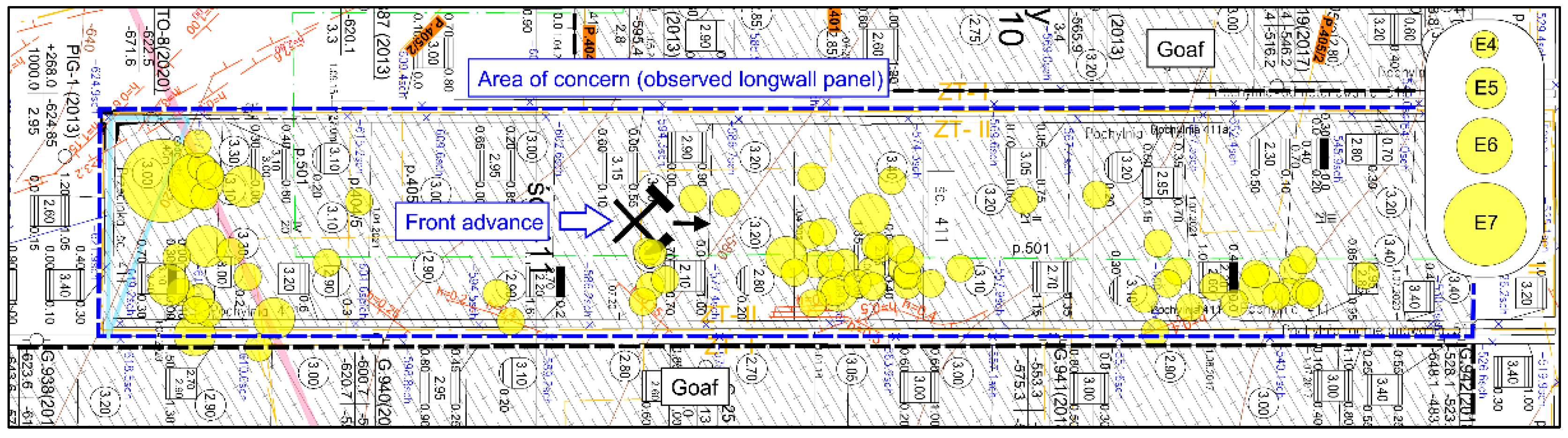 - Bańka, P.; Jaworski, A.; Plewa, F. Analityczne podejście prognostyczne, stosowane do oceny potencjalnego zagrożenia tąpaniami wyrobisk górniczych. Górnictwo Geol. 2011, 6, 23–35. (In Polish) [Google Scholar]