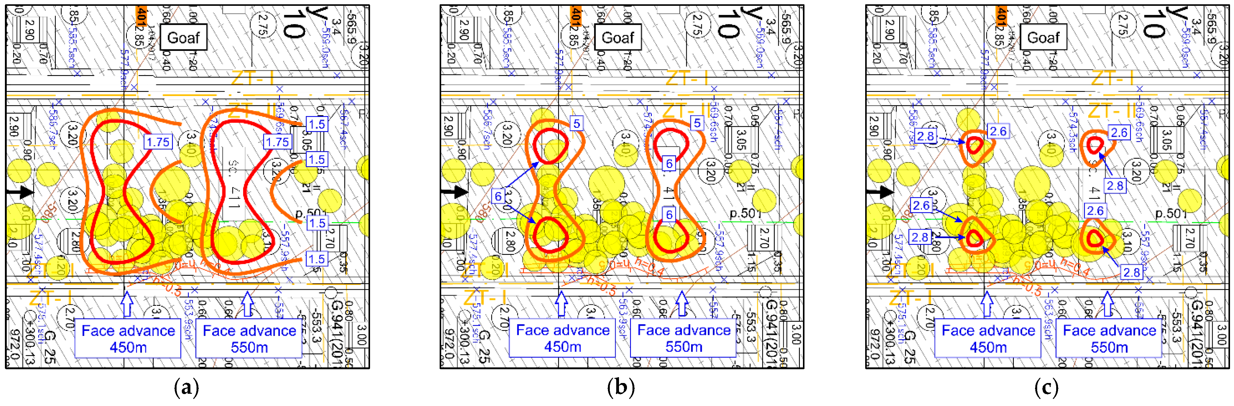 - Rezaei, M.; Hossaini, M.F.; Majdi, A. Development of a time-dependent Energy model to calculate the mining-induced stress over gates and pillars. J. Rock Mech. Geotech. Eng. 2015, 7, 306–317. [Google Scholar] [CrossRef]