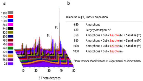 (a) Glass A high-temperature XRD plots. (b) Table summarizing major (M) and minor (m) cubic leucite and sanidine phases for glass A.