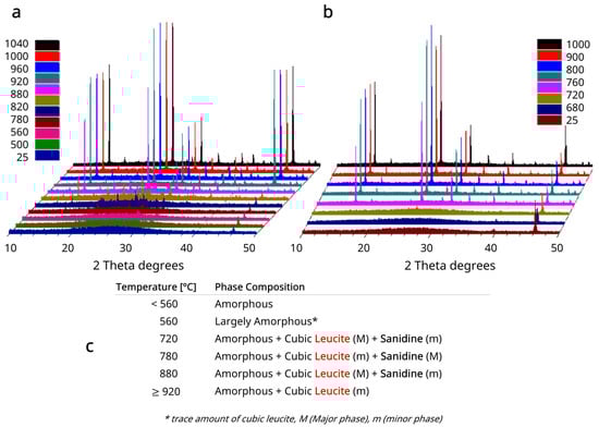 The HTXRD plots for glasses A and B with identified Sanidine and Leucite phases can be seen in Figure 1a and Figure 2a,b. Inset Tables in Figure 1b and Figure 2c summarize major (M) and minor (m) cubic leucite and sanidine phases and temperatures with the co-existence of both phases. Cubic leucite was the only phase identified in glass C HTXRD (Figure 2b).