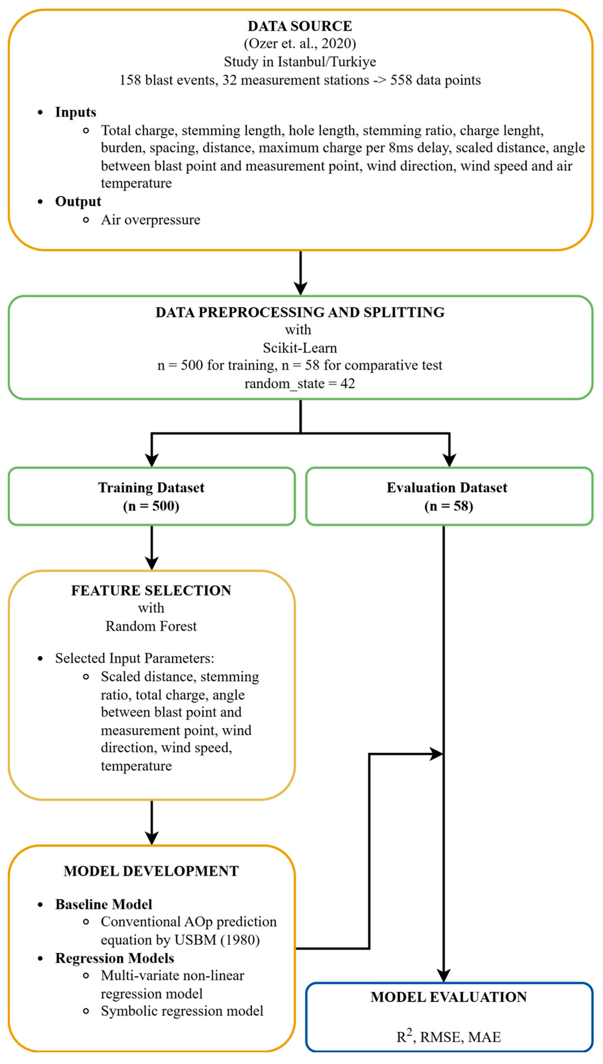 Blasting is the most common and economical method for excavating rock masses in the mining and construction sectors. However, this technique is highly inefficient in terms of energy conversion. In particular, only 20–30% of explosive energy is used for rock fragmentation and transportation, while most of the rest is released into the environment, creating undesirable effects such as ground vibration, air overpressure (AOp), flyrock, and gas and dust emissions. Among these effects, AOp is one of the most critical environmental problems owing to the structural vibrations and people discomfort caused by low-frequency AOp waves. Therefore, accurate AOp prediction is crucial for conducting blasting operations safely and in an environmentally responsible manner.