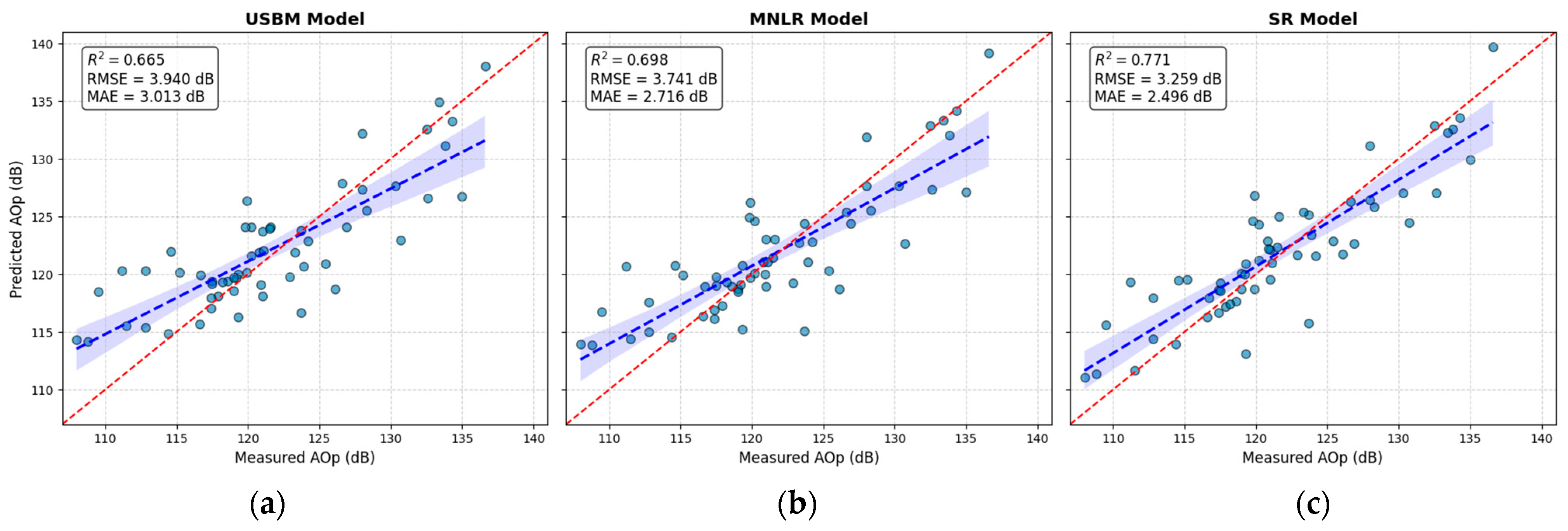 The SR model demonstrated superior predictive performance, outperforming both the industry-standard USBM empirical formula and the statistical MNLR model, achieving an R2 of 0.771 on the independent evaluation dataset. This corresponds to an improvement of approximately 7.3% in predictive accuracy compared with the MNLR model, reflecting SR’s ability to capture the complex and non-linear effects of meteorological variables on AOp.