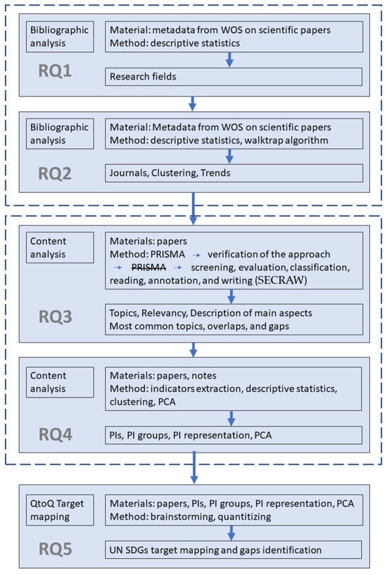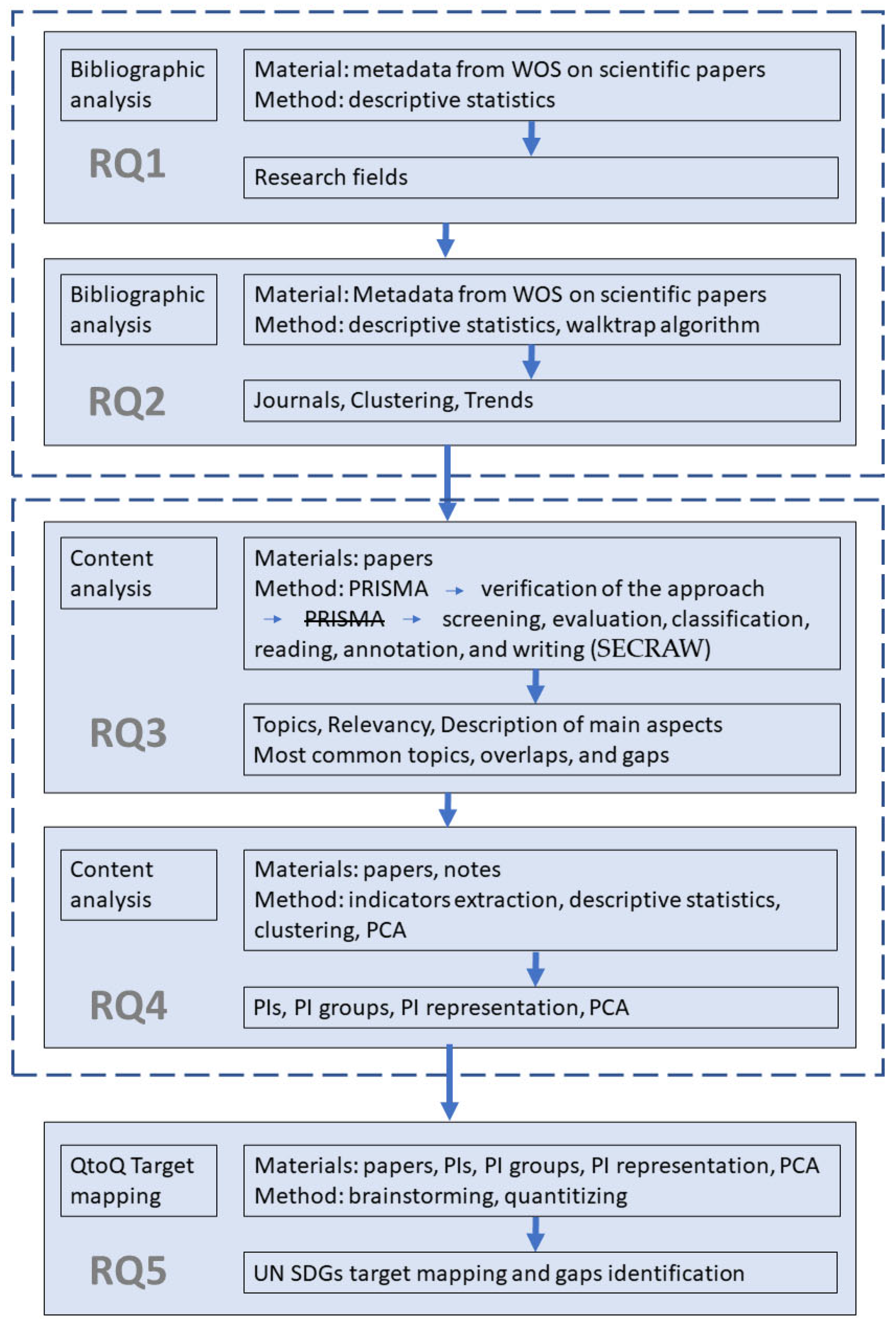The evaluators assigned the scores (minor, moderate, major, insignificant) during brainstorming by considering the texts, results of the indicator analysis, and PCA of the indicators. This approach was chosen because both the indicators and their use in the papers, as well as the UN SDGs, are complex and require interpretation. Therefore, simpler methods such as direct mapping using PCA (table) or frequency of indicators in the papers (table) could not be used. The evaluation was conducted at the lowest level—the level of targets (sub-goals). This was performed after completing the previous phases of the research to ensure a comprehensive overview of the results from those phases and the research questions. The evaluations were then quantitized. The proposed QtoQ Target mapping uses four categories: major contribution = 3, moderate contribution = 2, minor contribution = 1, and insignificant or no contribution = 0.