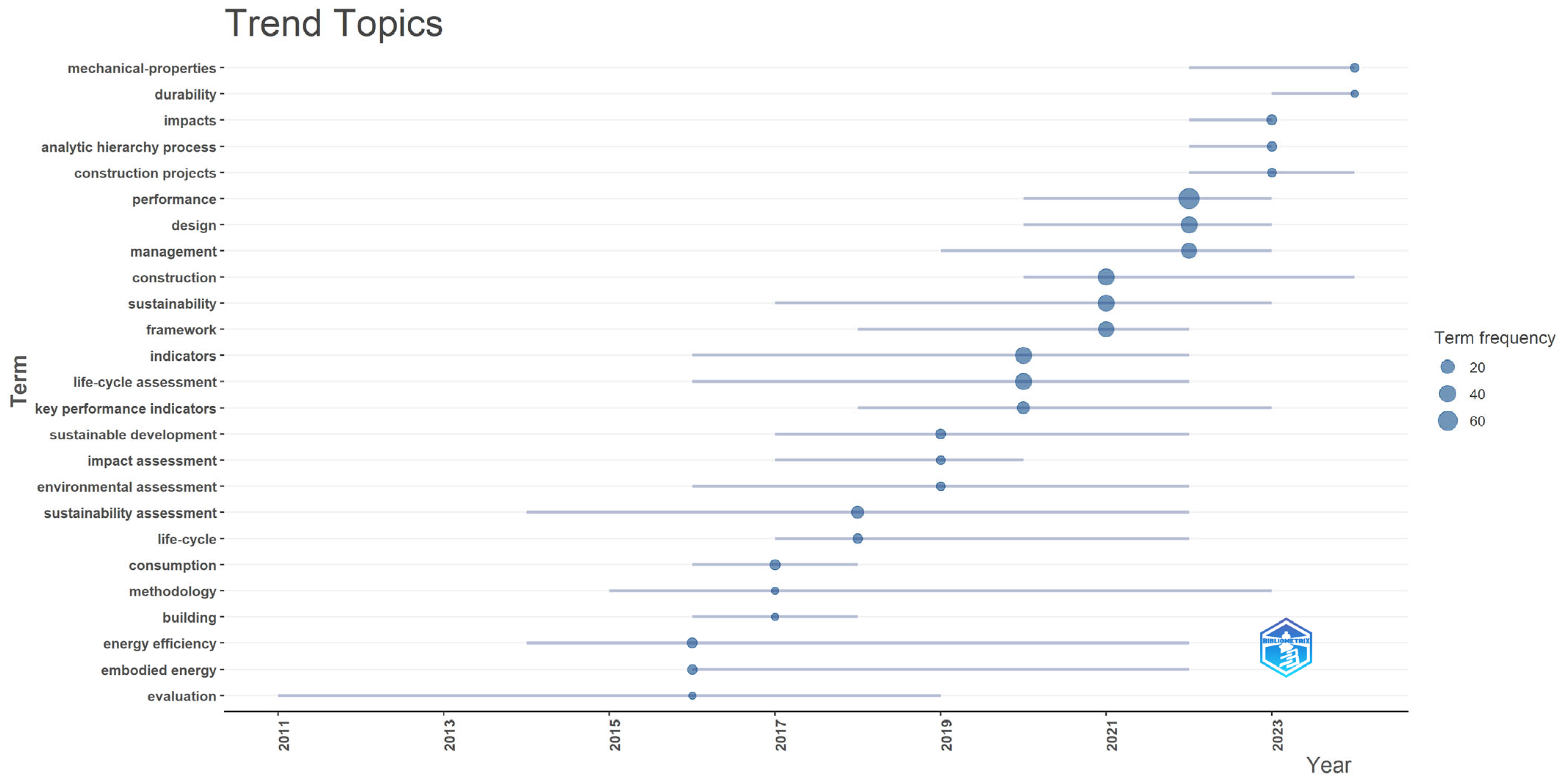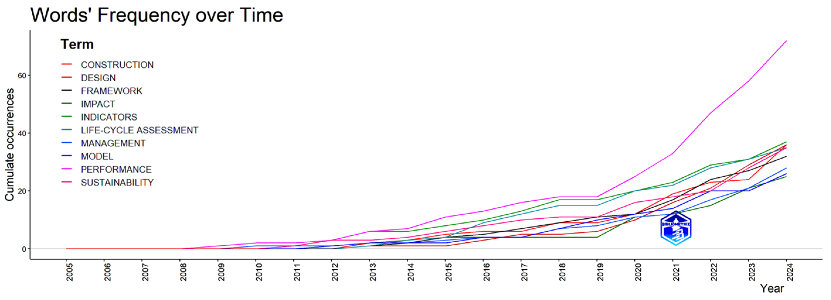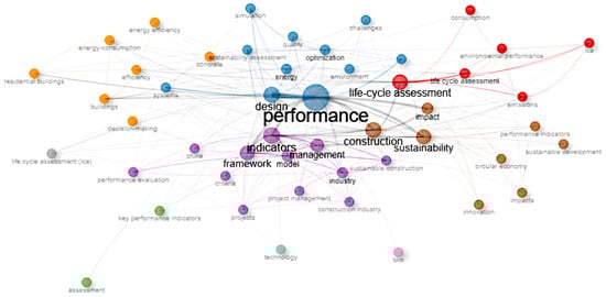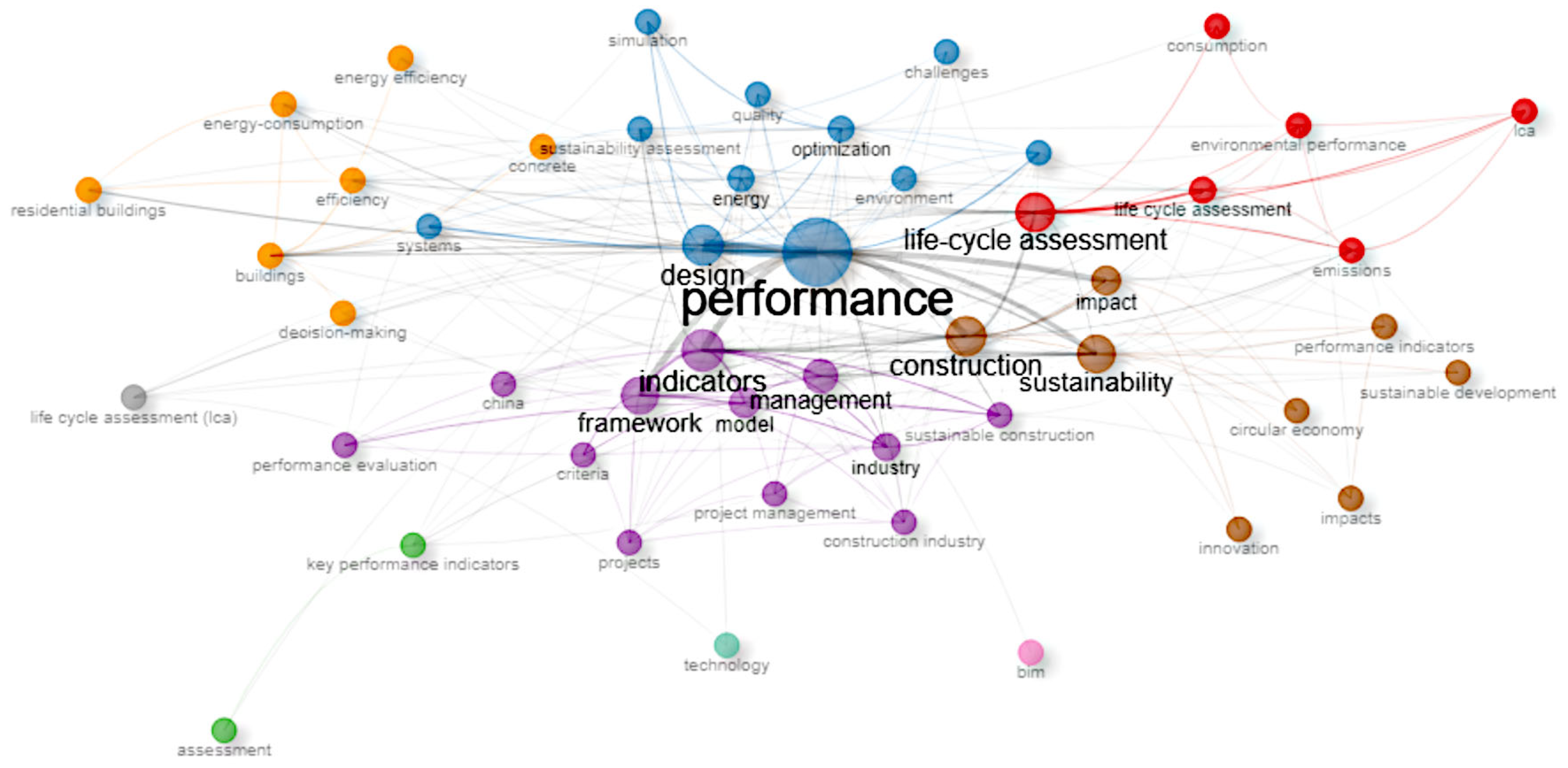 Keyword frequency was calculated based on the authors’ keywords using descriptive statistics in bibliographic software that aggregates the keywords and counts the frequency. The most common keywords, as shown in Table 7 and Figure 4, were performance, indicators, construction, design, life-cycle assessment, and sustainability. The field showed granularity through keywords such as efficiency, emissions, key performance indicators, sustainability assessment, systems, environment, simulation, and construction industry.