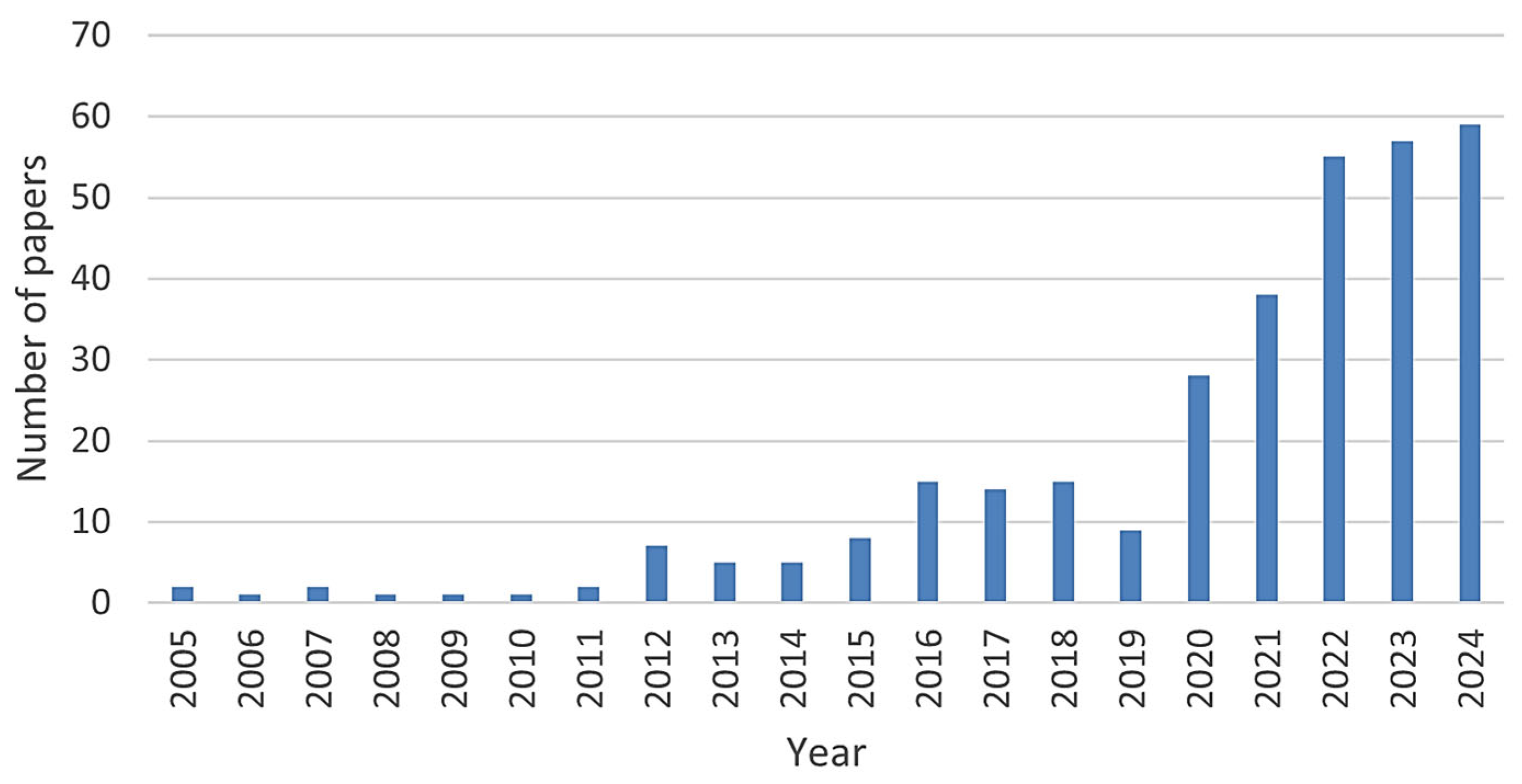 The level 5 query was used for the bibliometric analysis, based on data from the Web of Science (WOS) for the period 2005–2024, focusing on “Article” and “Review Article” document types. The bibliometric analysis was conducted using Biblioshiny, a visual tool based on the Bibliometrix package in RStudio 4.4.2. It statistically analyzes bibliographic data for a given dataset, such as papers extracted with the WOS query. Biblioshiny provides descriptive statistics, three-field plots showing connections among sources, authors, and keywords, authors’ production over time, corresponding authors’ country collaborations, most locally cited documents, reference publication year spectroscopy, trend topics and topic clustering, knowledge structures, a country collaboration world map, and other data in table, graphic, and textual formats. The textual format is generated through integration with Gemini AI via the Biblio module within Biblioshiny, which connects Biblioshiny objects to Gemini AI. It uses tables from Biblioshiny to create textual descriptions of the same data, ensuring that no additional data is used that could lead to hallucinations or different outcomes.