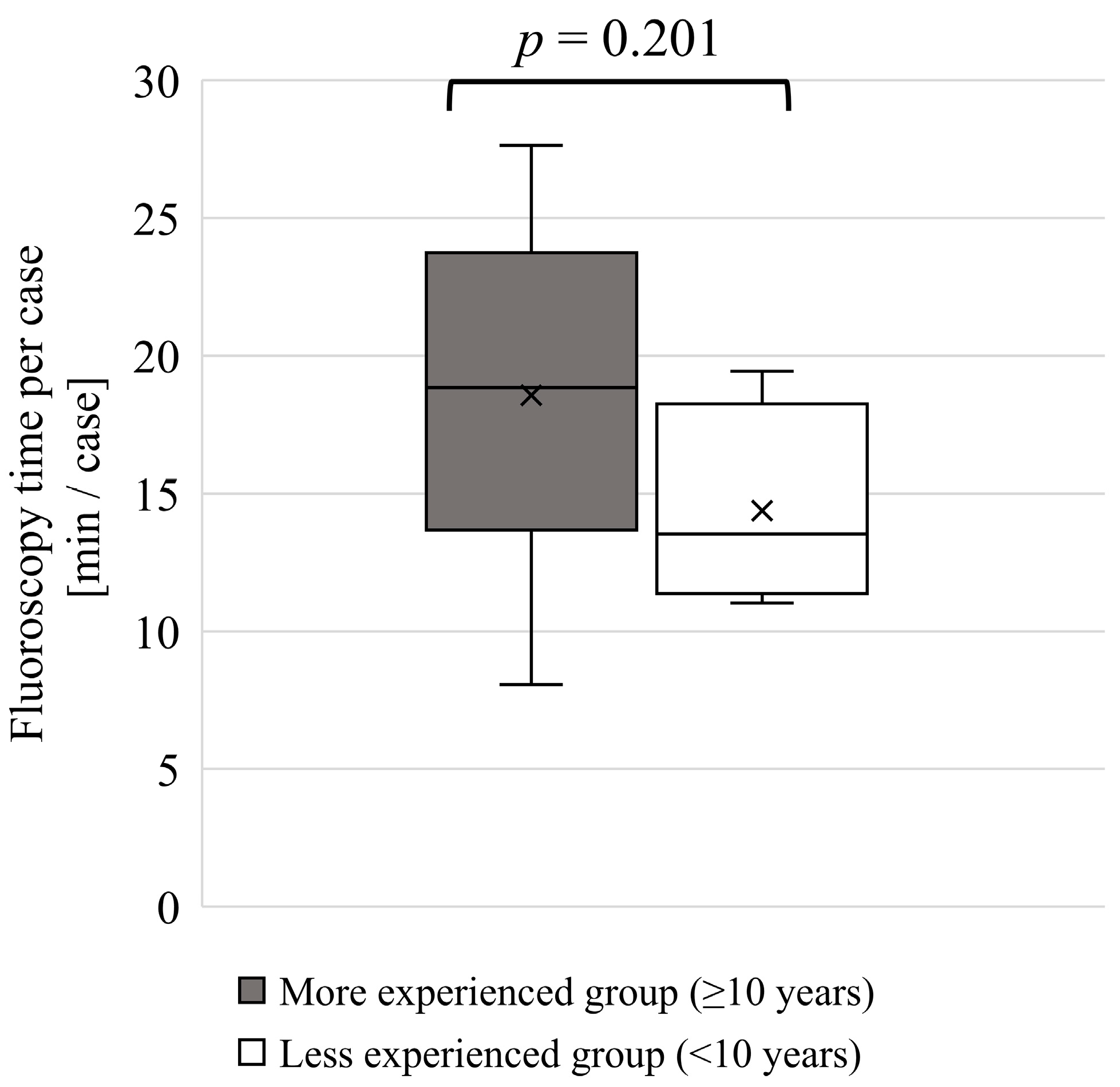 | Physician | Number of Procedures [Case] | Fluoroscopy Time Per Case [min] | Hp(0.07) from Neck Dosimeter [mSv] | Hp(3) from Lens Dosimeter [mSv] (Considering the Shielding Effect of Lead Glasses) | ||