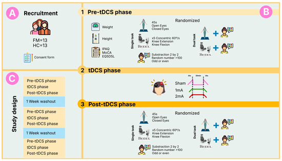 Overview of the study design. (A) Recruitment and allocation of participants to the fibromyalgia (FM) and healthy control (HC) groups; (B) Experimental phases detailing the assessments, single and dual-tasks, and stimulation conditions performed by each participant; (C) Randomized crossover design illustrating the three performed sessions and the washout periods between sessions.