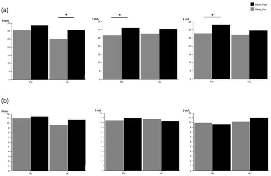 Cognitive accuracy in the fibromyalgia (FM) and healthy control (HC) groups during (a) single-task and (b) dual-task conditions during static balance tasks. Pre- and post-tDCS values are shown for sham, 1 mA, and 2 mA intensities. Significant differences within groups are indicated with asterisks (p < 0.05).