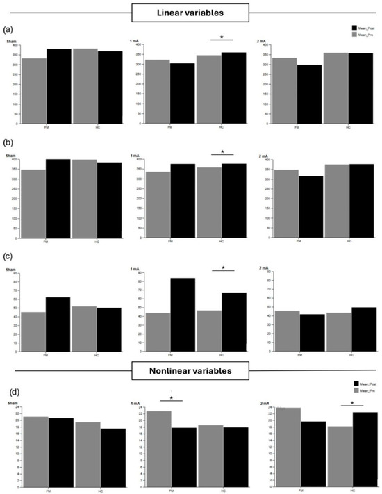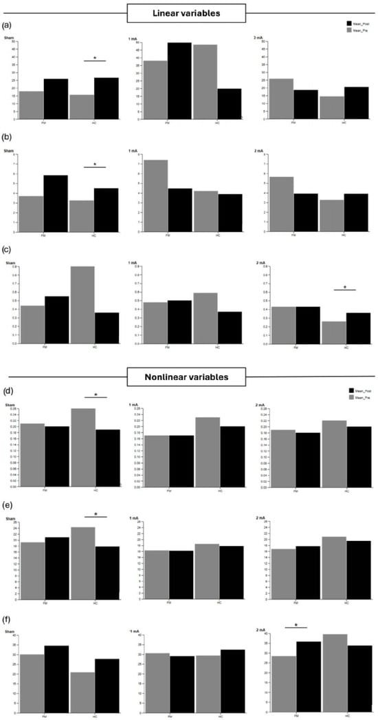 Linear postural sway variables (a) Area, (b) RMS AP, (c) RMS ML, and nonlinear postural sway variables (d) SampEn AP, (e) LyE AP, (f) LyE ML, during the single-task eyes-closed condition in the fibromyalgia (FM) and healthy control (HC) groups. Pre-post values are shown for sham, 1 mA, and 2 mA intensities. Significant differences within groups are indicated with asterisks (p < 0.05).