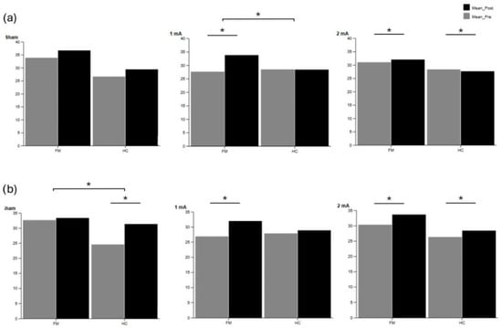 Cognitive accuracy in the fibromyalgia (FM) and healthy control (HC) groups during (a) single-task and (b) dual-task conditions during isokinetic tasks. Pre- and post-tDCS values are shown for sham, 1 mA, and 2 mA intensities. Significant differences within groups are indicated with asterisks (p < 0.05).