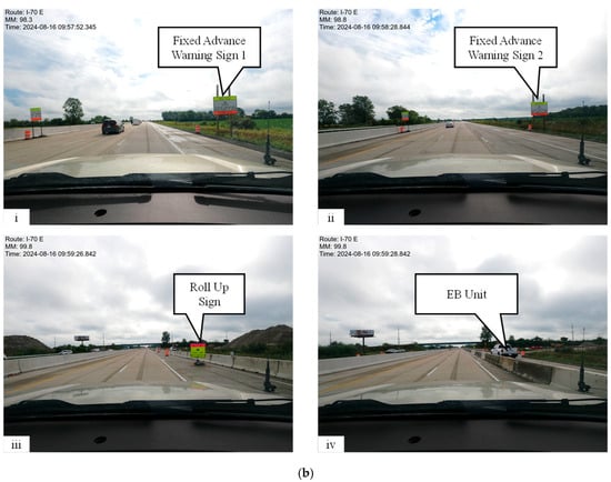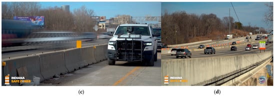 INDOT Safe Zones Worksite Speed Control Pilot Program []. (a) Active SSC on I-465 worksite; (b) SSC vehicle (callout i); (c) active SSC portable sign (callout ii); and (d) upstream fixed signs (callout iii).