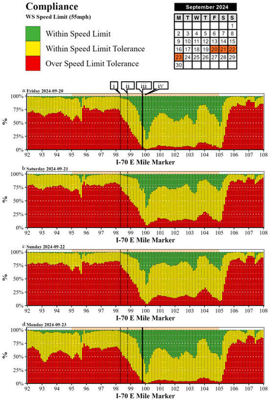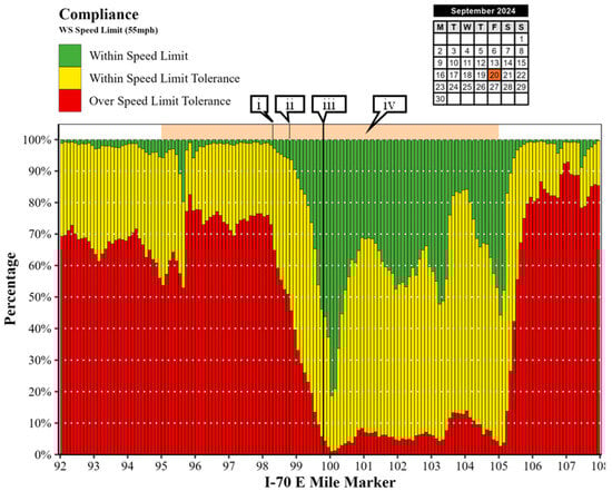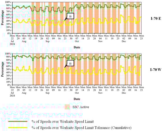 Callout i points to the date 13 August 2024, on which advance warning signs were installed on the worksite on I-70 EB in Hancock County, Indiana, with the first SSC session beginning the next day []. The solid black line indicates a daily value of the percentage of speed records detected in the SSC unit’s MM location that were 11 mph or more above the WS speed limit. Similarly, the solid blue and pink lines indicate this percentage of speed records at the MM location of the first and second fixed advance warning sign, respectively. Shaded regions of the plot indicate days on which active SSC was present, with the color of the shaded region representing one of four unique MM locations where the SSC unit was situated over this worksite’s 5-month study period.