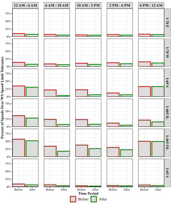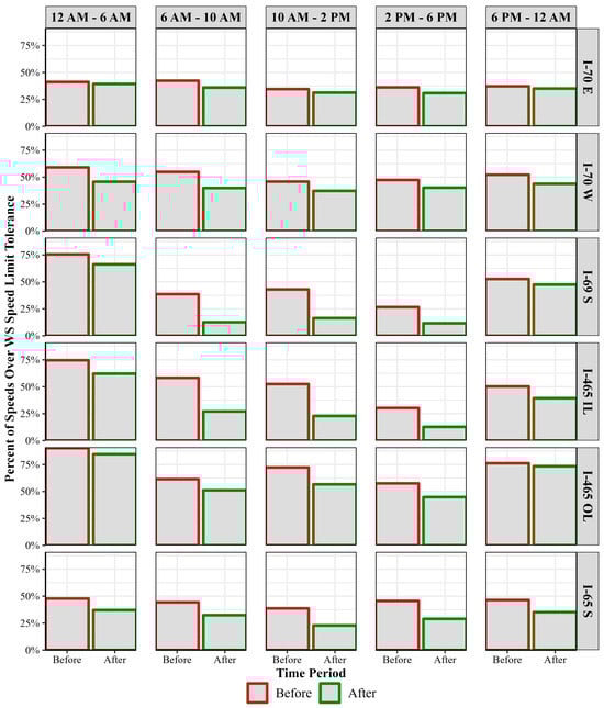 In order to obtain a more holistic view of speed compliance trends within a worksite and an SSC unit’s impacts outside of actual SSC times, a 24 h analysis of speed compliance trends is presented in this section. Five different time periods are defined covering the 24 h timeframe: 12 AM–6 AM, 6 AM–10 AM, 10 AM–2 PM, 2 PM–6 PM, and 6 PM–12 AM. The first and final period witnessed no active SSC during the analysis period but served to provide a glimpse into the rollover impact, if any, of active SSC into the overnight hours. All SSC activities were performed in one or more of the middle three time periods from 6 AM to 6 PM.