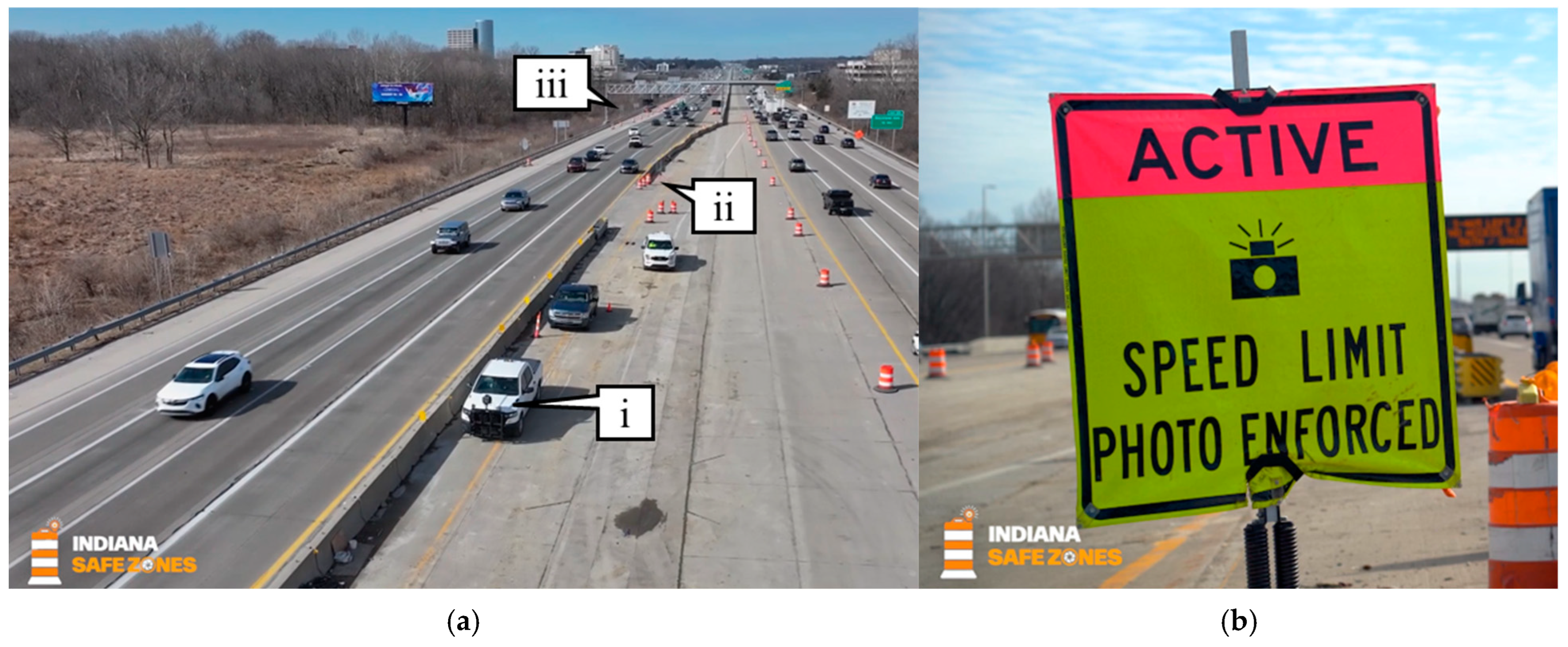 Figure 1. INDOT Safe Zones Worksite Speed Control Pilot Program [25]. (a) Active SSC on I-465 worksite; (b) SSC vehicle (callout i); (c) active SSC portable sign (callout ii); and (d) upstream fixed signs (callout iii).