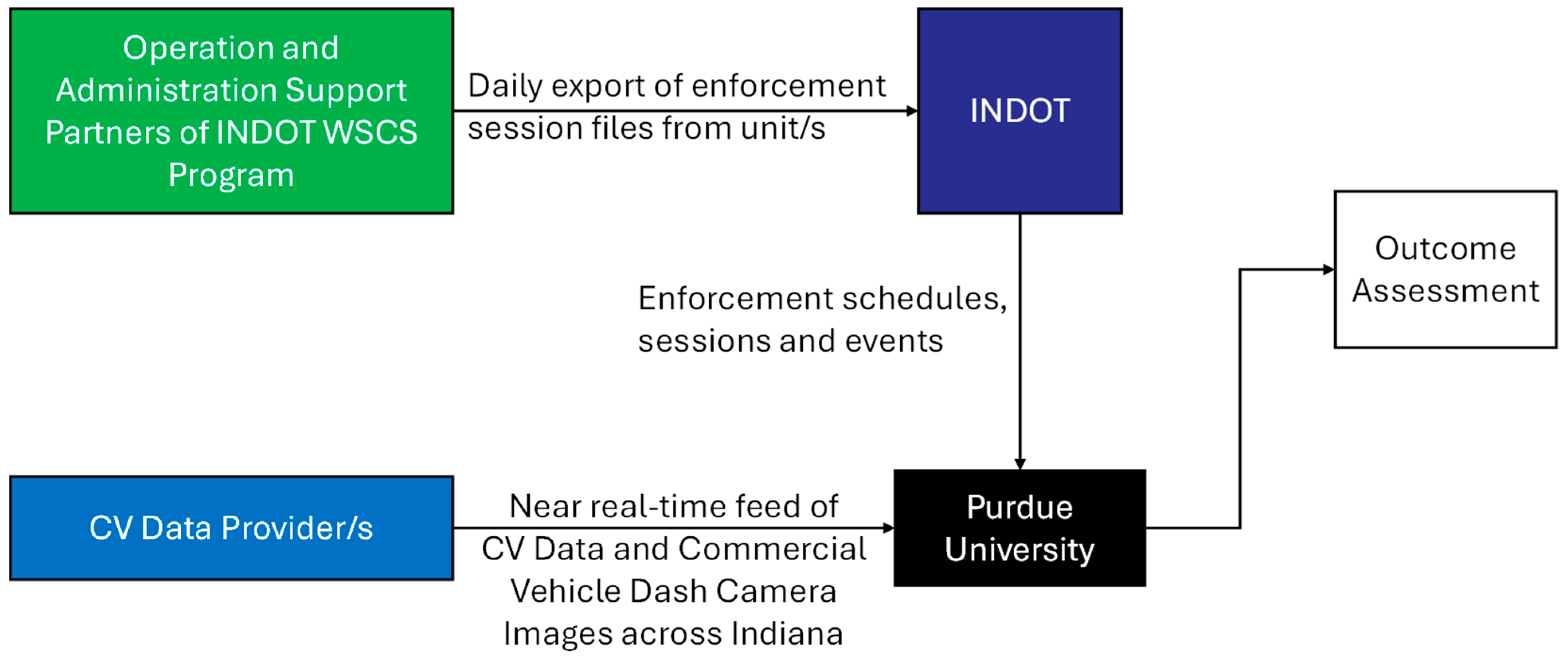 This section describes the data used to analyze approximately 100 million passenger vehicle records and 3 million commercial truck records to identify spot speed characteristics of those two classes of vehicles between August 2024 and July 2025. Details are explained on how spot speed proportions for 0.1-mile-long segments are computed. The evaluation focuses on summarizing the percentage of speed records exceeding the worksite speed limit by 11 mph or more by day by hour. This hourly data summary can then be used to compare speed characteristics during different periods of the day and assess the impact of SSC. The flow chart shown in Figure 2 provides an overview of the data flow and coordination among stakeholders.