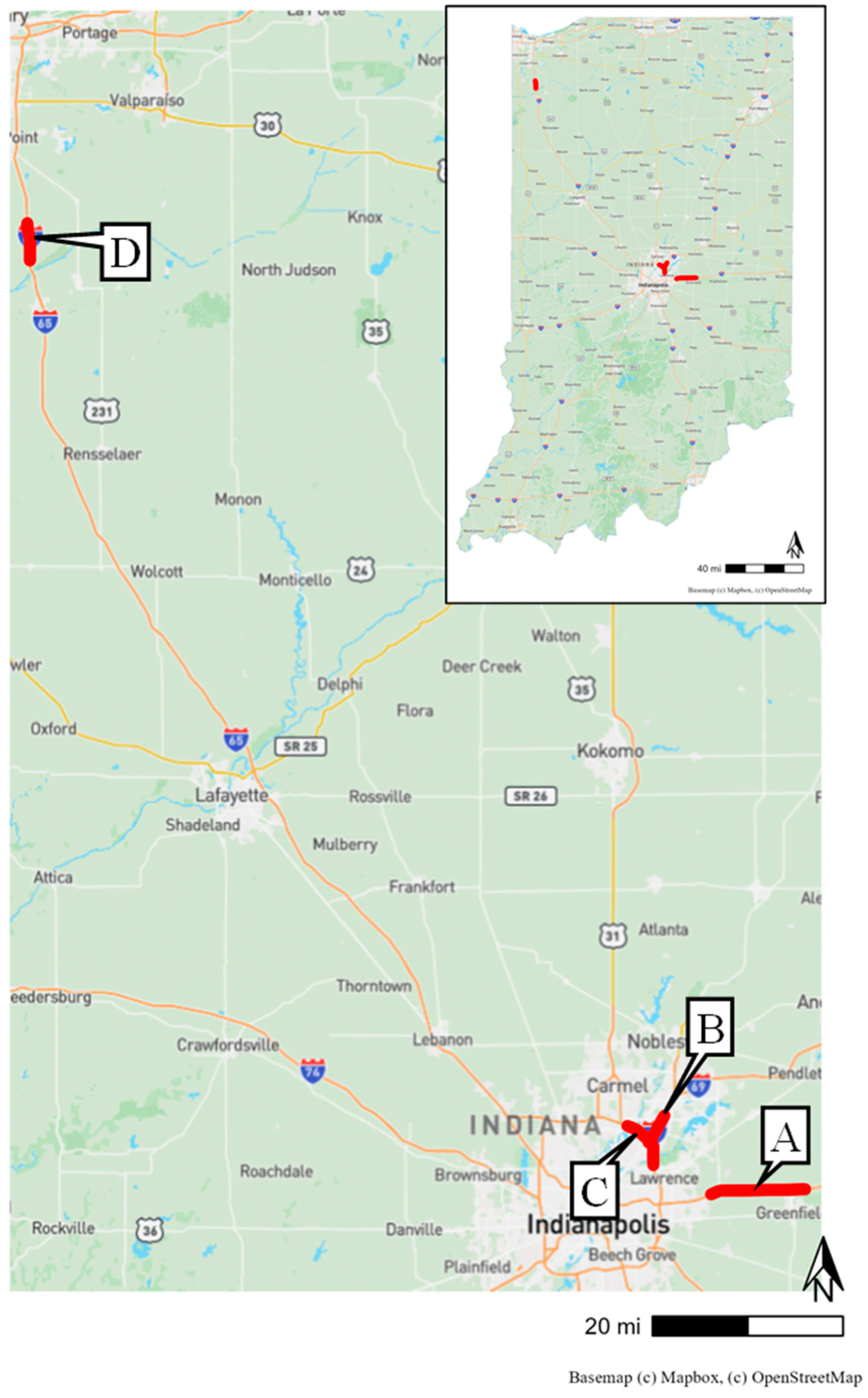 • The subsequent I-69 deployments (Figure 3, Location B) were only deployed in the southbound direction, and assessment was performed from 15 January 2025 [30] through 11 July 2025.