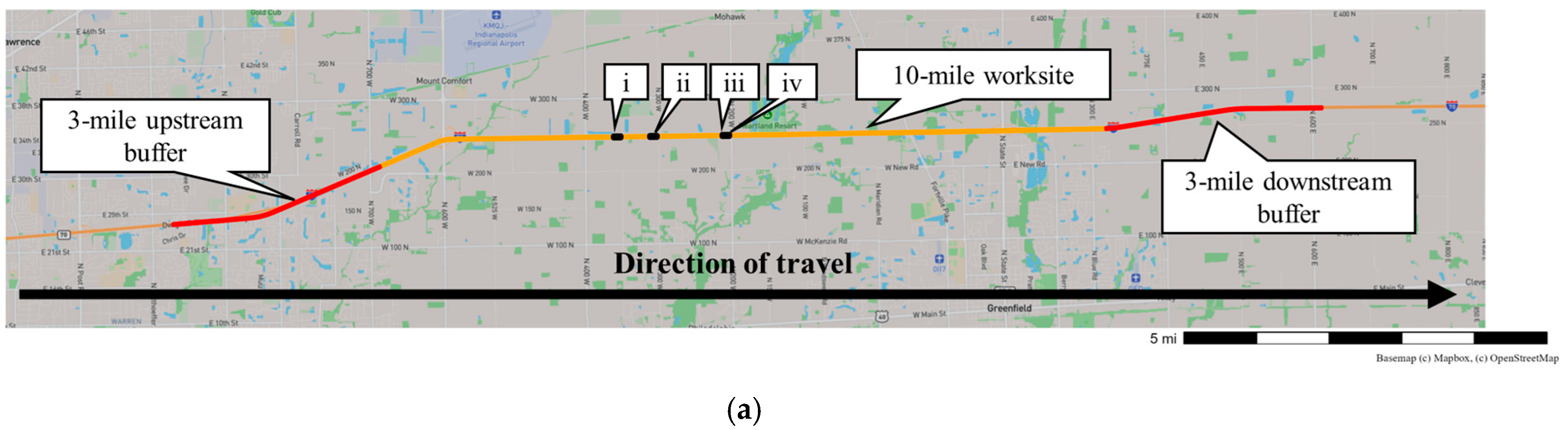 Figure 3 shows a map view of the four worksites analyzed by this study along I-70 (callout A), I-69 (callout B), I-465 (callout C), and I-65 (callout D). The first three worksites were located in the greater Indianapolis area in Marion County and Hancock County, while the most recent I-65 worksite is located in northwest Indiana in Lake County. The I-70 worksite spanned 10 miles, followed by the I-465 worksite at 5 miles, the I-65 worksite at 3.8 miles, and the I-69 worksite at 3 miles. A 3-mile buffer was added both upstream and downstream of each worksite’s MM limits to capture spillover impacts in the immediate vicinity of the worksite as well.