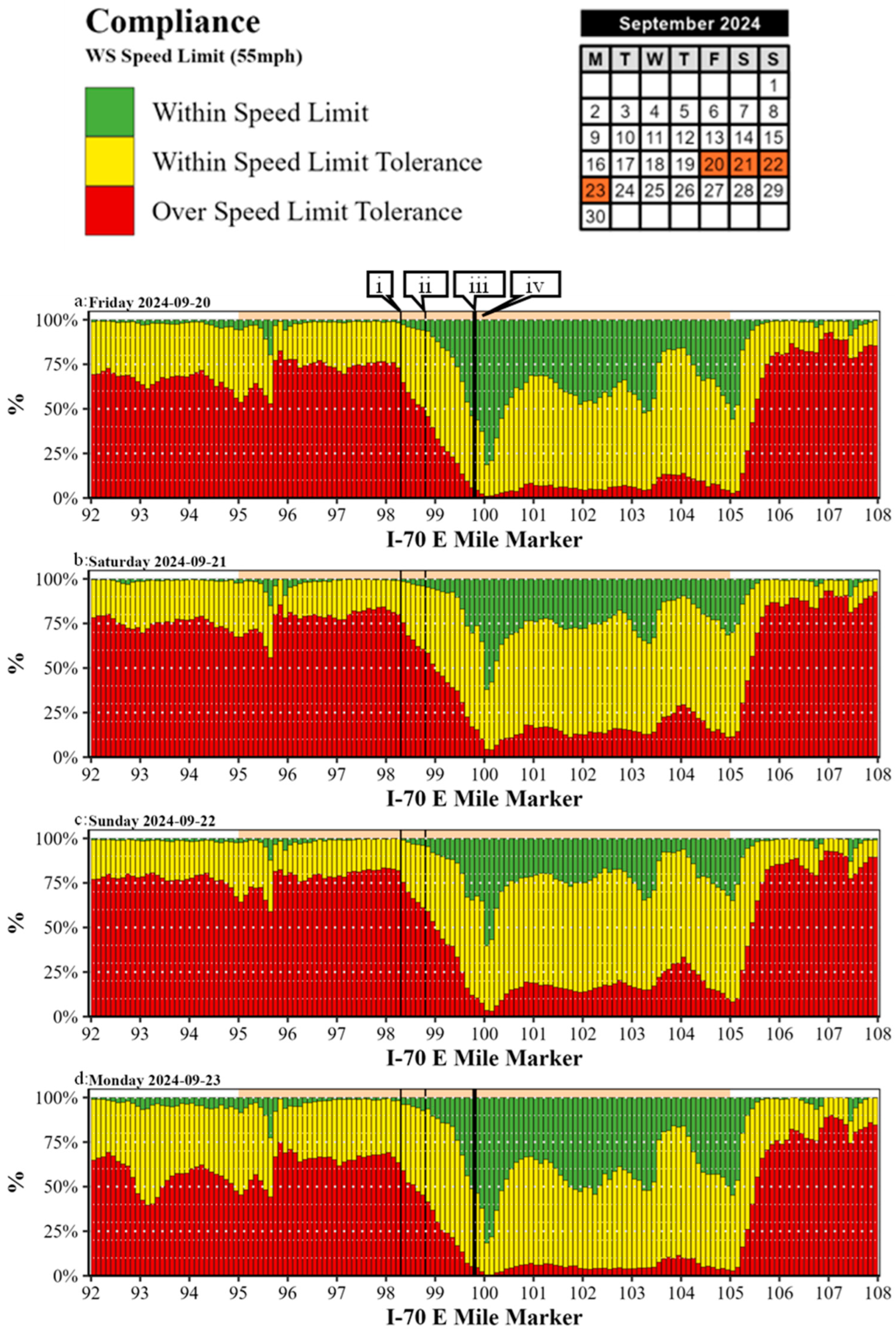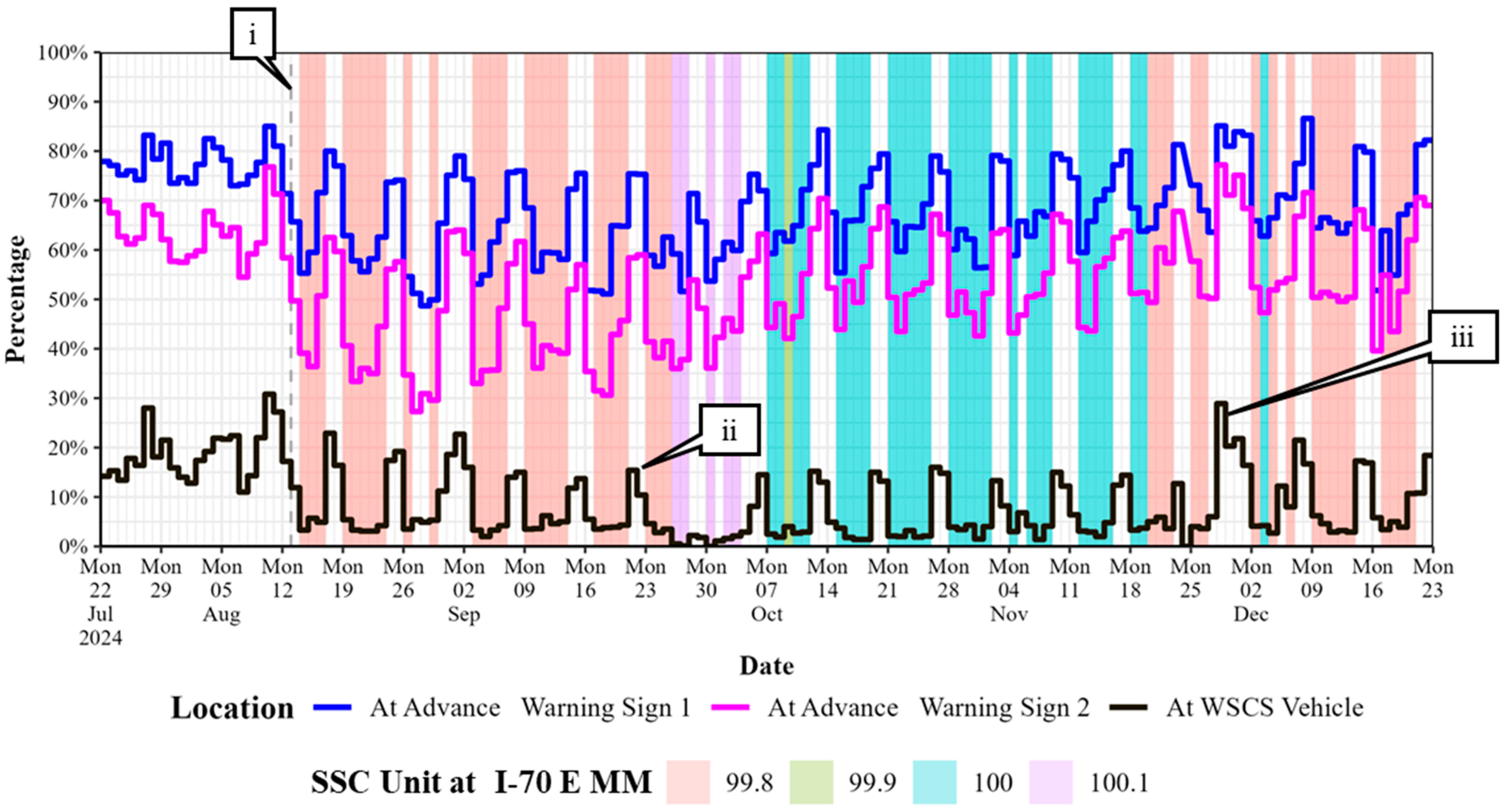 Callout i points to the date 13 August 2024, on which advance warning signs were installed on the worksite on I-70 EB in Hancock County, Indiana, with the first SSC session beginning the next day [32]. The solid black line indicates a daily value of the percentage of speed records detected in the SSC unit’s MM location that were 11 mph or more above the WS speed limit. Similarly, the solid blue and pink lines indicate this percentage of speed records at the MM location of the first and second fixed advance warning sign, respectively. Shaded regions of the plot indicate days on which active SSC was present, with the color of the shaded region representing one of four unique MM locations where the SSC unit was situated over this worksite’s 5-month study period.