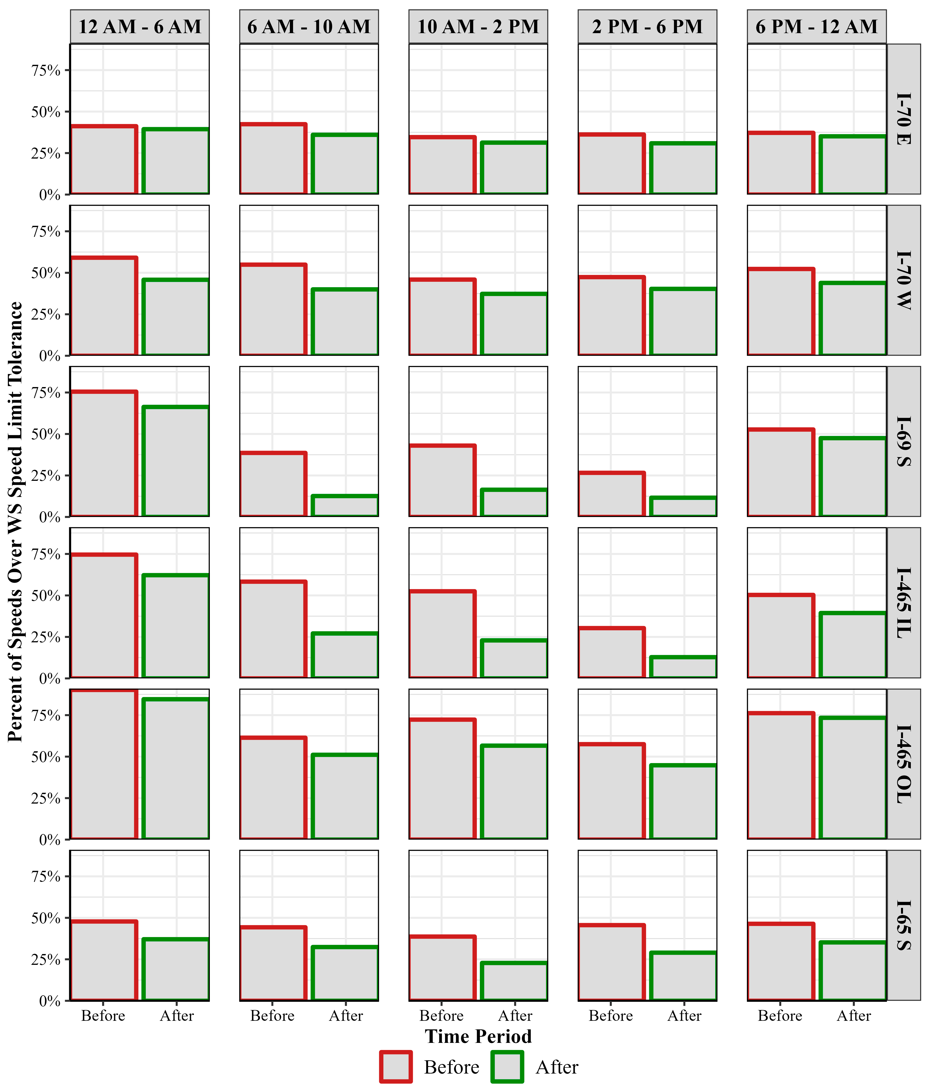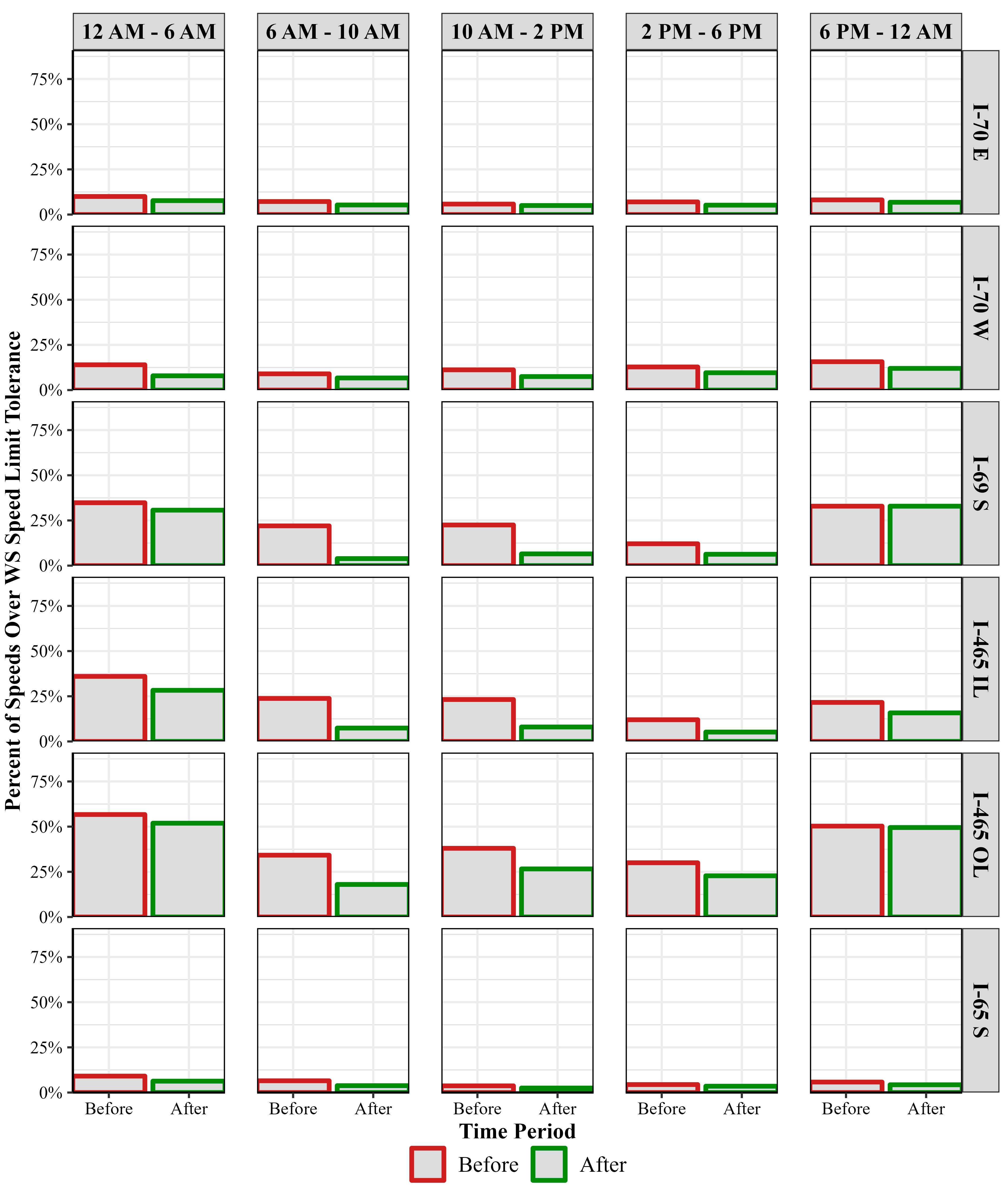 For passenger vehicles, the two largest absolute drops in percentage of speed records 11 mph or greater than the WS speed limit were seen on the I-465 IL worksite for the 6 AM–10 AM (drop from 58% to 27%) and 10 AM–2 PM (drop from 52% to 23%) time periods. Correspondingly, for commercial trucks, the two largest absolute drops were seen on the I-69 S worksite (drop from 22% to 4%) and the I-465 IL worksite (drop from 24% to 7%), both in the 6 AM–10 AM time period.