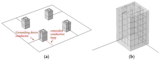 This article establishes a finite-element simulation model for a concrete tower foundation. The main column measures 1200 mm × 1200 mm × 2000 mm. The grounding grid is made of a flexible graphite composite and is buried at a depth of 0.8 m. Inside the foundation, eighteen vertical reinforcement bars with a diameter of 22 mm are distributed in the vertical direction, and six horizontal stirrups with a diameter of 20 mm are evenly arranged in the horizontal direction. The temperature at the foundation surface and at the far field of the soil is fixed at 20 °C. Convective heat transfer between the foundation surface and the ambient air is imposed, with a heat transfer coefficient of h = 10 W/·(m−2·K−1). Figure 1a illustrates the multiphysics simulation model of the tower foundation and grounding network, where the red dashed line indicates the concealed conductive loop. Figure 1b presents a schematic diagram of the internal structure of the tower foundation with the concealed conductive loop.