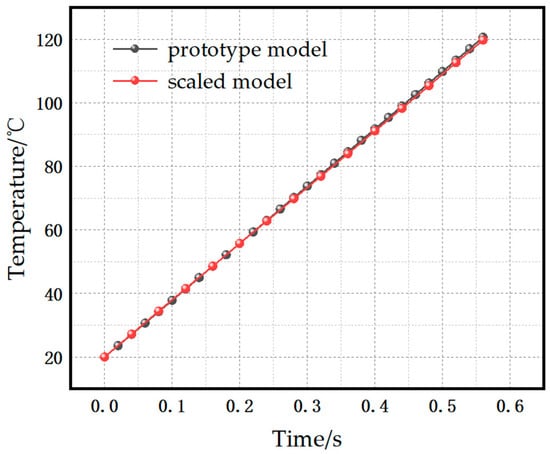 To minimize the errors introduced by fixed parameters in the scaled experimental model, namely, to ensure that the result of Equation (23) equals 1, either the current duration or the current amplitude can be adjusted. For the 1/4-scale model, the current duration corresponds to one-fourth of that in the prototype. Under otherwise identical conditions, this study chooses to reduce the applied current amplitude to one-eighth of the prototype value, ensuring that the resulting temperature rise accurately reproduces the prototype’s thermal trend. A comparative analysis is then conducted on the simulation model after applying this current amplitude correction.