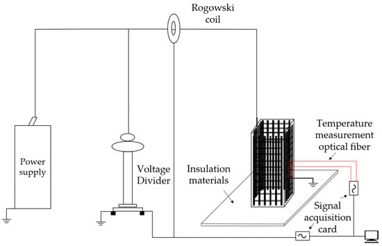 Because the damage caused by power-frequency follow currents is substantially greater than that of lightning currents, an experimental apparatus for investigating foundation impact behavior under power-frequency follow currents was designed and assembled; a schematic of the test rig is shown in Figure 5. The test system comprises an AC power supply, a voltage divider, Rogowski coils, the concrete scaled foundation model, thermocouples for temperature monitoring, and a data-acquisition card. The power source is a 500 A AC generator; loop current and voltage measurements are performed using a Rogowski coil and a voltage divider with ratios of 100:1 and 5000:1, respectively, connected to the acquisition system.