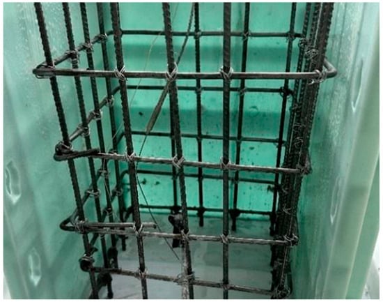 A reinforcement cage was fabricated by tying Ø5.5 mm longitudinal bars and Ø5 mm stirrups, as illustrated in Figure 6. Thermocouple-equipped optical fibers were embedded adjacent to the reinforcement at the concealed conduction location and cast integrally with the concrete; surface-mounted thermocouples were attached to the concrete surface above the concealed conduction site for external temperature monitoring. Approximately 5 cm of exposed rebar was reserved at the concrete surface to serve as the current-injection electrode. The concrete used in the test is C30 ordinary concrete, and the specific mix proportions are shown in Table 5.