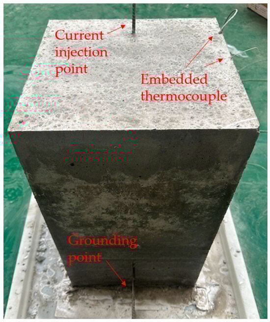 Photographs of the cast scaled model are presented in Figure 7. The internal concrete at the grounding point was designated as the concealed conduction center. During fabrication, two thermocouples were tied beside the reinforcement at the concealed conduction center and cast together with the reinforcement cage. After curing, surface thermocouples were attached at the corresponding locations. See schematic in Figure 8.