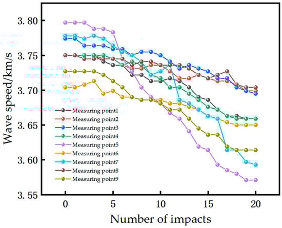 The concrete foundation was subjected to twenty AC current impacts of 0.3 kA. After each impact, the specimen was allowed to cool before ultrasonic inspection was performed at the predefined measurement points. The accuracy of ultrasonic testing is influenced by factors such as the coupling between the probe and the specimen, the surface roughness of the specimen, and the inherent uncertainties of the pulse generator and standard attenuator. Therefore, during the testing process, any abnormal data points were remeasured, and the average value obtained from multiple measurements was taken as the final wave velocity result. The variation in each measurement point with increasing impact count is shown in Figure 9.