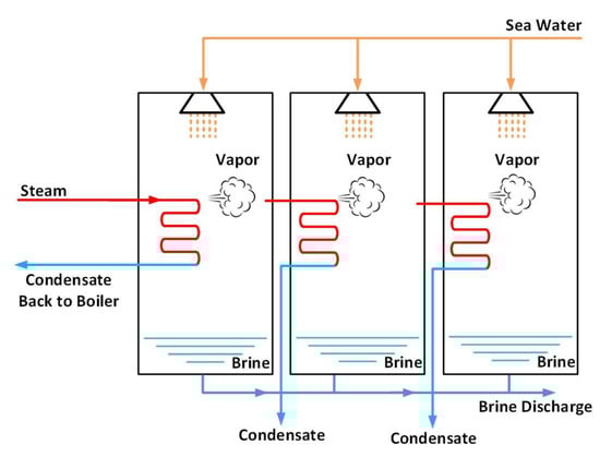 Multi-Effect Distillation is a robust thermal desalination process renowned for its high efficiency. The core principle involves repeating the evaporation and condensation process across multiple stages, known as “effects.” In a typical MED plant, steam or hot water from an external source (often a power plant for co-generation) flows through the tubes of the first effect. This heats the feed seawater, causing it to evaporate [,]. The generated vapor then serves as the heat source for the subsequent effect, which operates at a lower pressure and temperature (Figure 2).