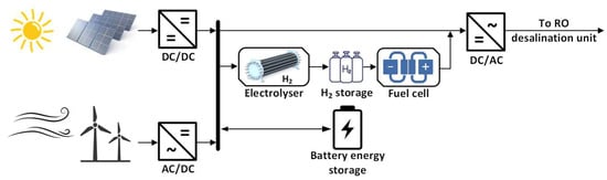A layout of solar- wind- powered desalination RO plant with a hybrid fuel cell—battery storage system.