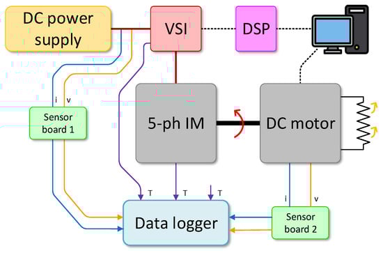 Figure 3 presents a diagram of the experimental setup. The main elements are the five-phase IM (5-ph IM), the voltage source inverter (VSI), and the digital signal processor (DSP). The sensor boards and data logger are used to obtain signals; in particular, measurements of voltage, currents, and temperature are considered. Finally, the DC motor is used to provide a mechanical load that is independent of the speed.