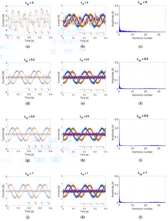 Figure 5 presents both simulation and experimental results for a representative case, corresponding to rpm with a load resistance of 100 . When , the controller focuses exclusively on current tracking in the plane, while the x − y components remain unregulated. Consequently, significant current amplitudes appear in the x − y subspace, which do not contribute to torque production and lead to increased copper losses.