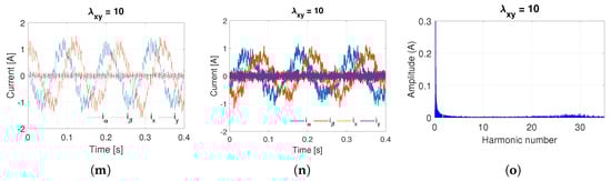 The results demonstrate that the tuning of plays a crucial role in balancing current quality, switching effort, and energy losses. When , the controller neglects the x − y current components, leading to significant currents that increase both copper and inverter losses. Conversely, moderate values of (between 0.2 and 1) effectively suppress these components, yielding a consistent reduction in total DC power consumption without compromising mechanical output power. However, excessively large values () cause the controller to over-penalize the harmonic subspace, resulting in elevated switching activity and increased commutation losses. This reveals the existence of an optimal range for that maximizes overall system efficiency.